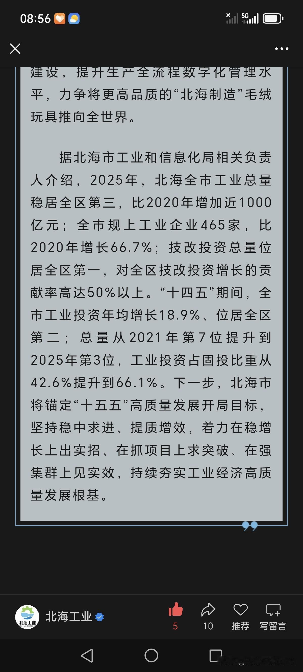 官宣了!北海市工业和信息化局公众号“北海工业”报道:“2025年,北海全市工业总量稳居全区第三,比2020年增加近1000亿元……”。 北海以最少的土地面积倒数第二的人口数赢得工业总量稳居全区第三,这的确是个了不起的成绩!北海既是旅游城市也是广西的工业强市! 看了图片3,有些人看到自己所在的人口大市却排名靠后,既酸又不服,妄言“我只相信官宣”,然而一个被寄予厚望却交不出佳绩的学生会主动公示成绩单吗?!所以没有官宣太正常了! 奉劝某地人别再臆想浮夸了,脚踏实地干出成绩,成果才会水到渠成!
