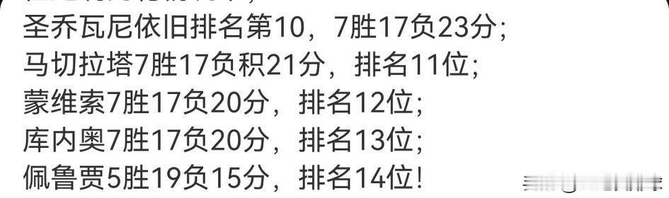 意甲要降级球队可谓厮杀激烈。除了佩鲁贾已经铁定降级外。另一支目前还未明。 圣乔瓦尼、马切拉塔、蒙维索、库内奥皆是7战17负。 只不过圣瓦乔尼积分23分排名第10,安全区! 具体积分请看图2! 目前还剩2轮,圣瓦乔尼剩余2个对手基耶里和布斯托。 而意甲第24轮,蒙维索爆冷3:1胜基耶里,下一轮看圣瓦乔尼能不能爆冷。 反正2朵中国金花在意甲都竞相绽放。庄宇珊一传排名主攻榜第2,朱婷扣球成功率和效率都位居主攻榜第1,边攻第2! 不容否认:中国的主攻实力在世界还是强大的。 上一轮朱婷轮休,下一轮朱婷大概率要首发!拿下佩鲁贾手拿把掐。