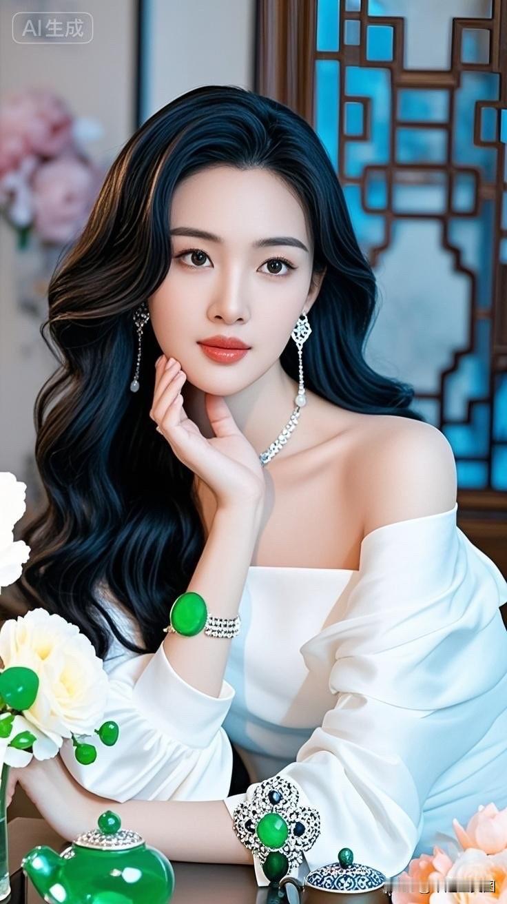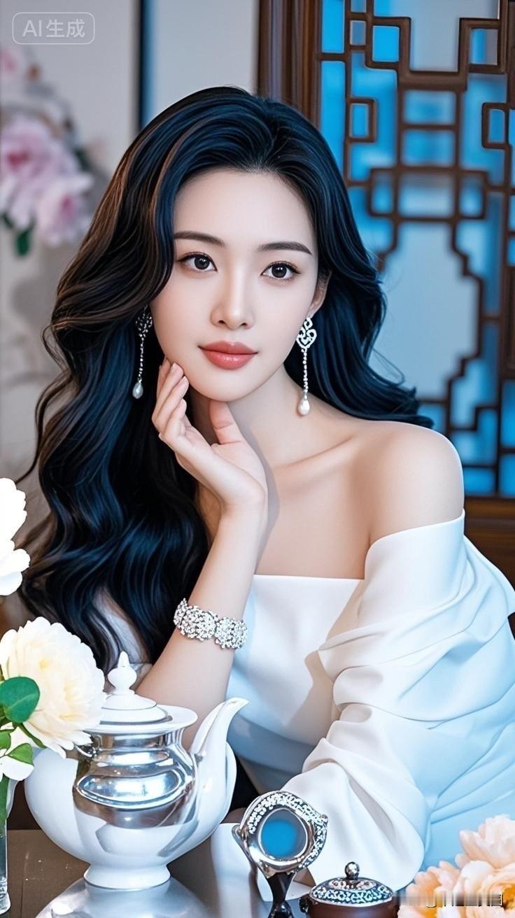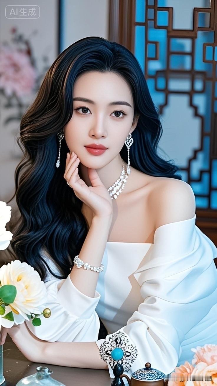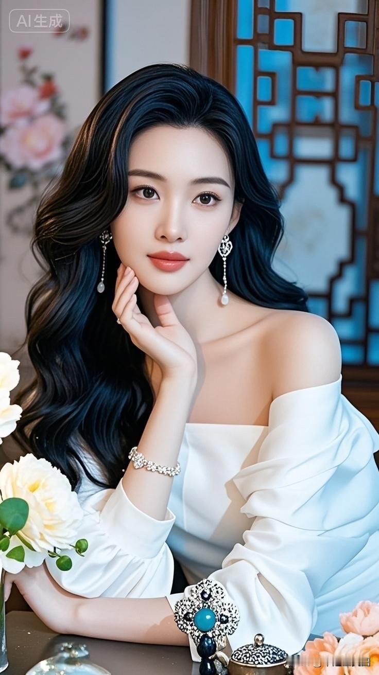 优雅黑发美人,珍珠耳环与白裙相映成趣,尽显高贵气质。