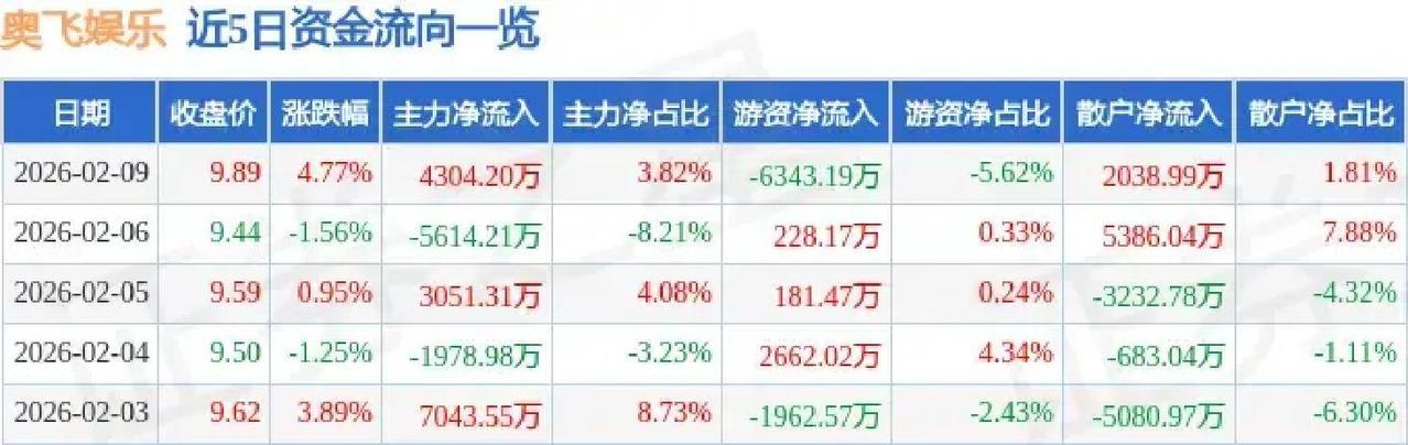 2月10日深圳股市,奥飞娱乐直接拉涨停,股价冲到10.88元,成交额高达22亿多,换手率超21%,这波猛涨让不少人看傻眼。 影视动漫板块当天集体爆发,整体涨幅接近10%,动漫概念也跟着大涨近10%,NFT相关热度不减,大家都在抢这个赛道。 前一天主力资金净流入超4300万,显示机构态度很积极,虽然游资有点撤,但散户也跟进不少,资金面明显偏暖。 公司2025年业绩预告扭亏为盈,预计赚6000万到8000万,比上年大增超120%,这直接给了市场信心爆棚的底气。 靠着喜羊羊与灰太狼、超级飞侠这些国民IP,加上潮玩业务和AI技术加持,年轻化转型走得稳,产品卖得火。 板块联动效应强,春节档电影热炒带动整个影视链条复苏,动漫玩具需求跟着水涨船高。 短期看技术面金叉出现,上涨动能足,但高换手也藏着波动风险。 整体判断,这波涨停不是单纯炒作,业绩反转叠加IP价值重估,才是真支撑,动漫娱乐赛道还有空间影视娱乐概念股 奥飞娱乐市值 奥飞路演