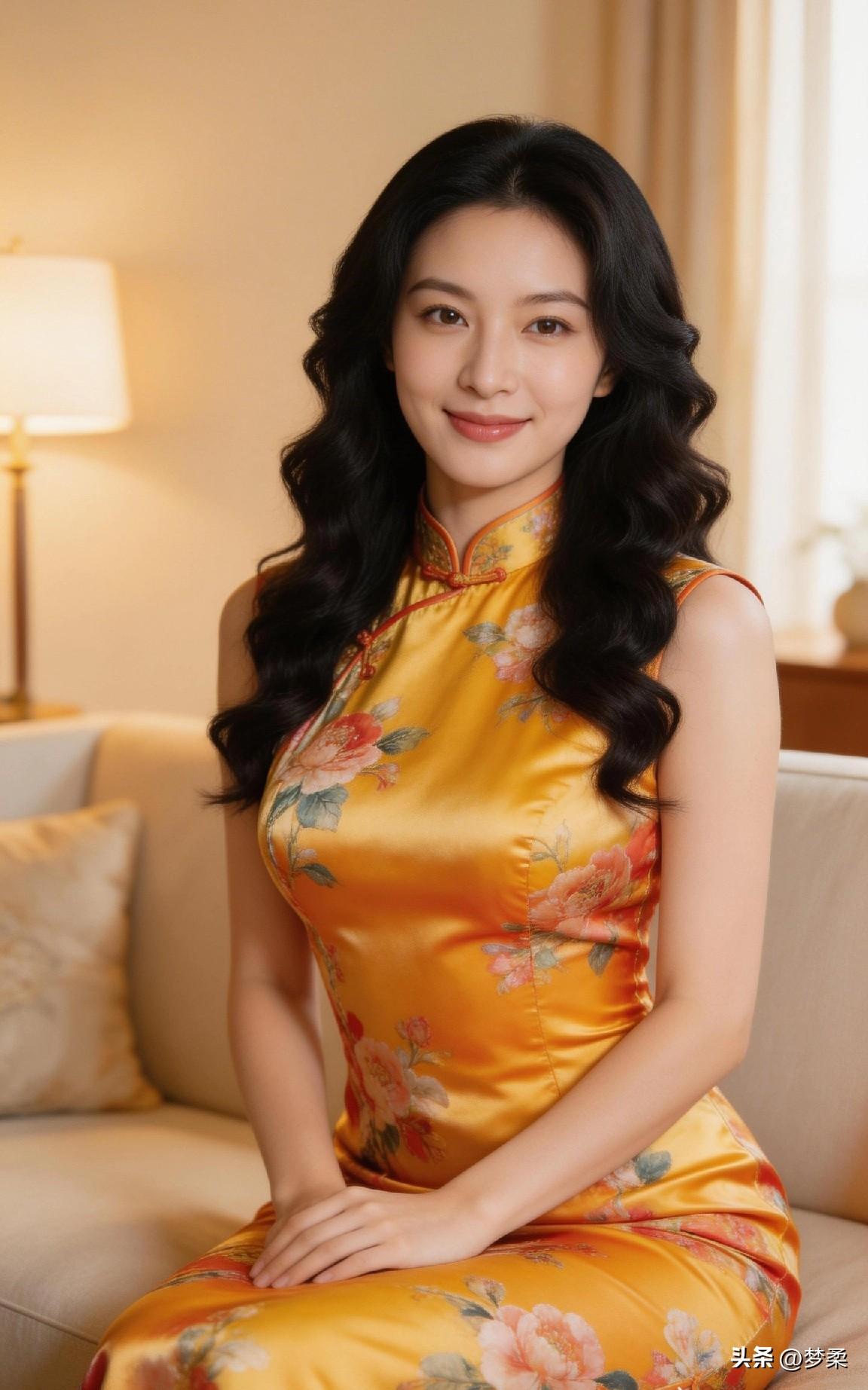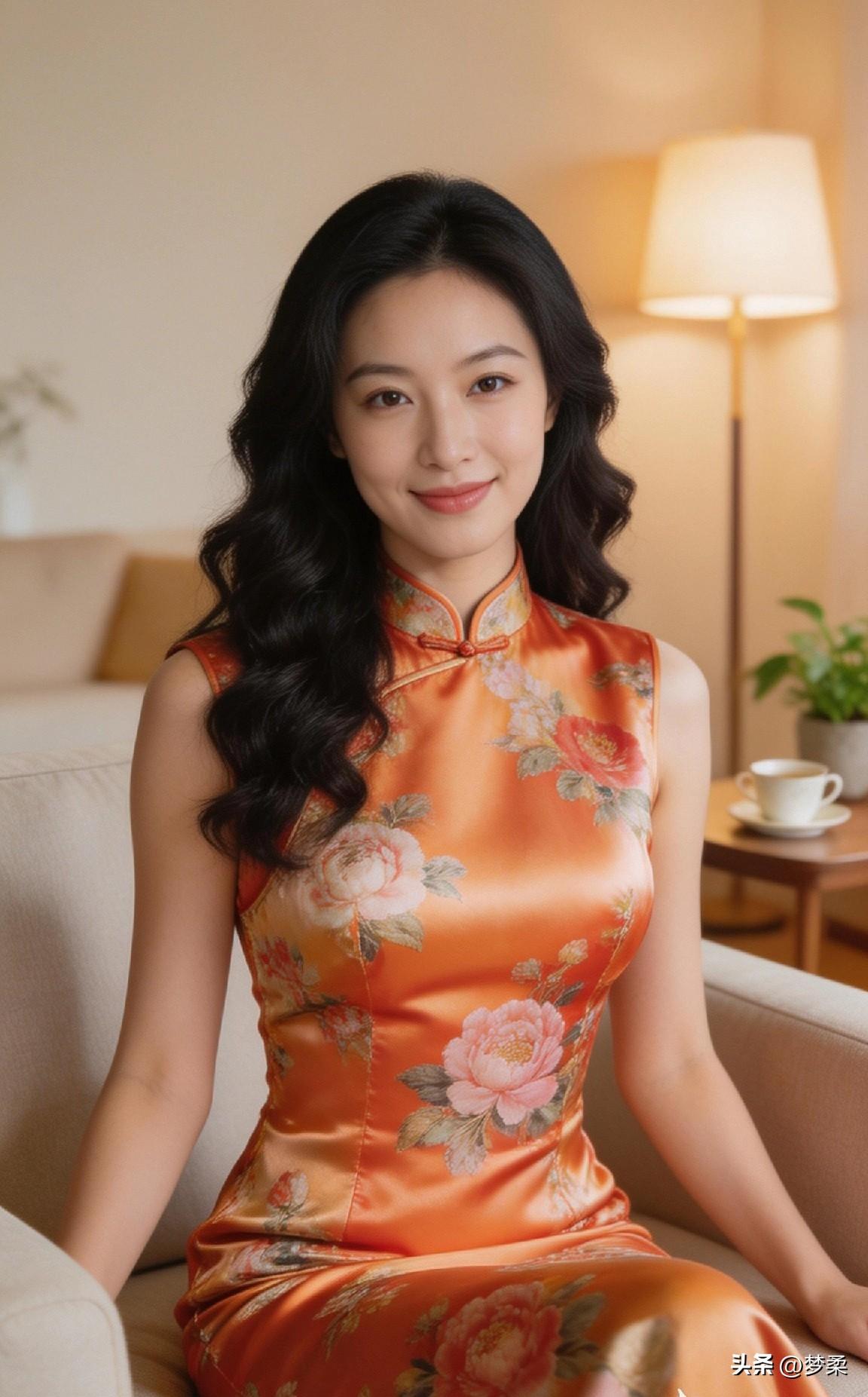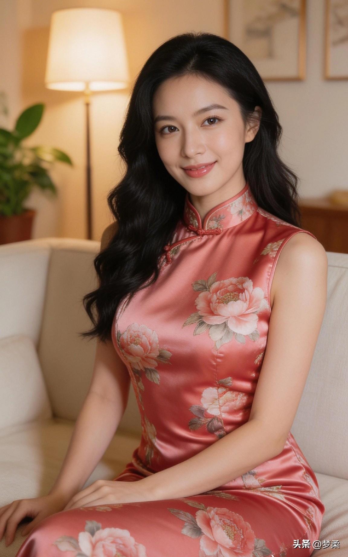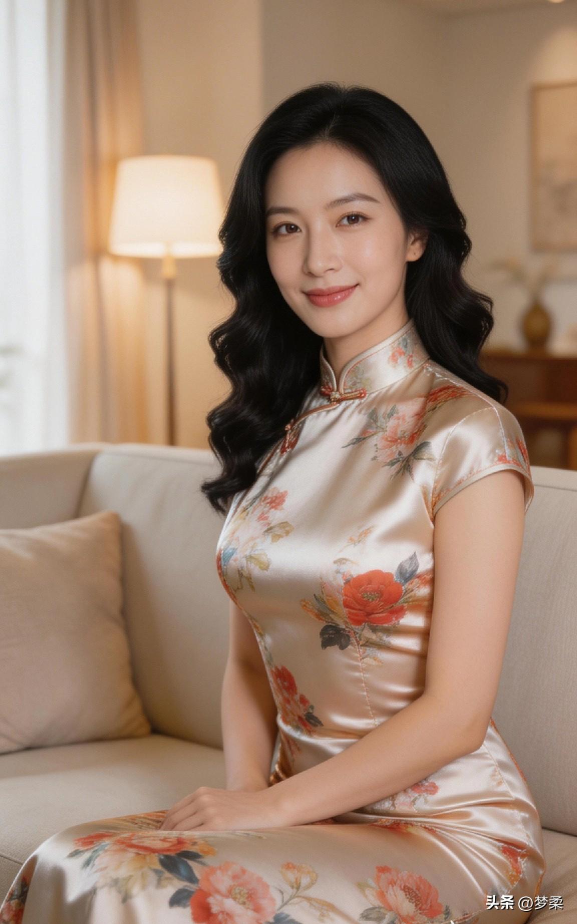 就像图中这件米白色真丝旗袍,没有浓烈的色彩,却以细腻的光泽感勾勒出曲线,领口的珍