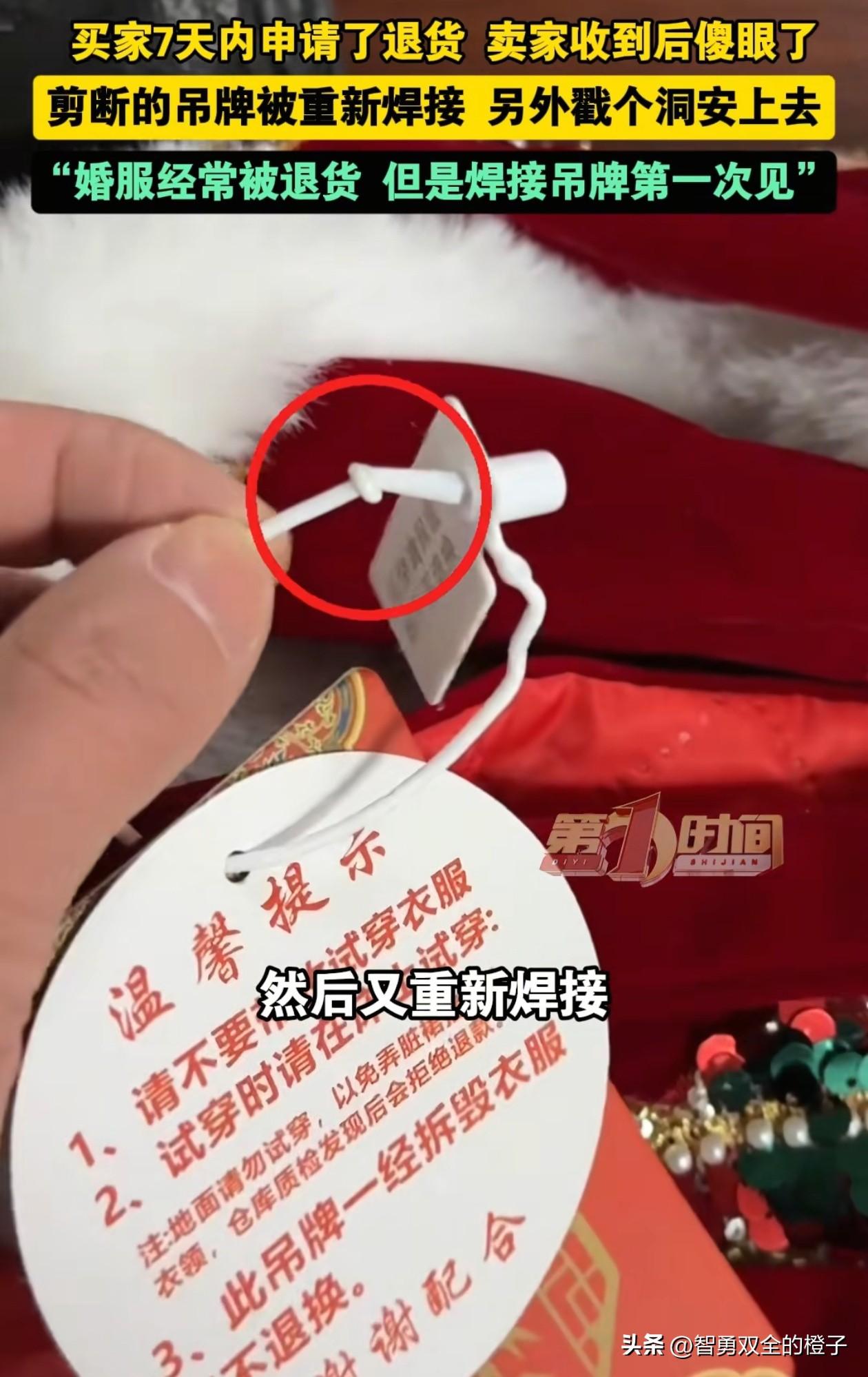 真是个会“过日子”的新娘!安徽,女子网购敬酒服,婚礼完成后,又把衣服给商家退回去,为了不让商家看出来,女子居然把拆掉的标签又重新焊上,结果被商家发到网上吐槽,真的好丢人。 商家说,经常遇到退换婚服的,但基本上都是尺码不合适的,还是第一次碰到焊吊牌的,这位新娘在大学里肯定学的电焊专业,焊接得很完美,简直是“心灵手巧”。 虽然不知道她嫁得好不好,但那个地方的路肯定不好走,裙摆下方全是污渍,知道的你是去结婚,不知道你还以为去扶贫了! 有网友建议商家,把衣服留着,等女子下次她来买的时候,再把这件发给她。 还有网友说,一件衣服也不贵,留下来当个纪念,多有意义呀,或者租一件就好了! 结婚这么重要的日子,要么租、要么买,不知道为什么有人能把便宜占得如此心安理得,现在全网都知道了,好丢人[捂脸]