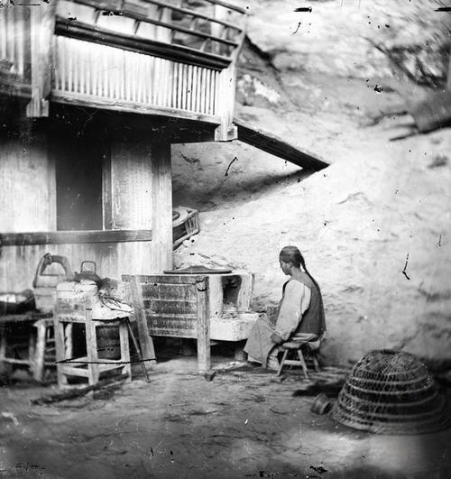 这张照片出自苏格兰摄影师约翰·汤姆逊之手,拍摄于1868-1872年间的厦门,是他记录晚清中国社会的珍贵影像之一。 照片中,一位留着长辫的男子正坐在矮小的木凳上,专注地对着一个简易的灶台烧火做饭。这个灶台由粗糙的石块和木板搭建而成,旁边的木桌上放着水壶和简单的炊具,地上还有一个大竹筐。