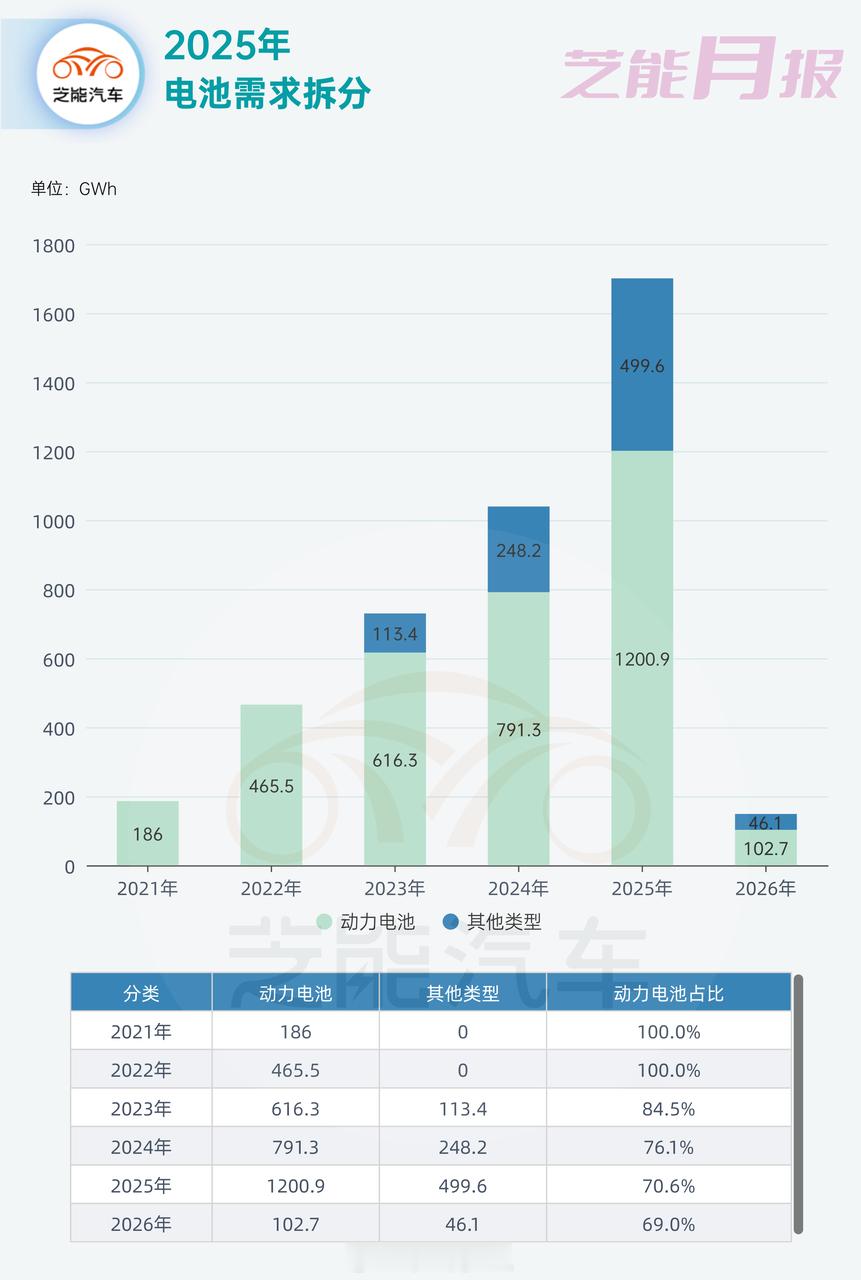 铁锂依然是绝对主流,占比接近八成。如果按车型拆分来看,更清晰:◎ 纯电乘用车占60.3%,同比微降1.4%,回归到25GWh左右。◎ 插混乘用车占22.2%,同比增长22.1%,下降到9.3GWh左右。◎ 纯电货车占15.2%,同比增长41.9%。