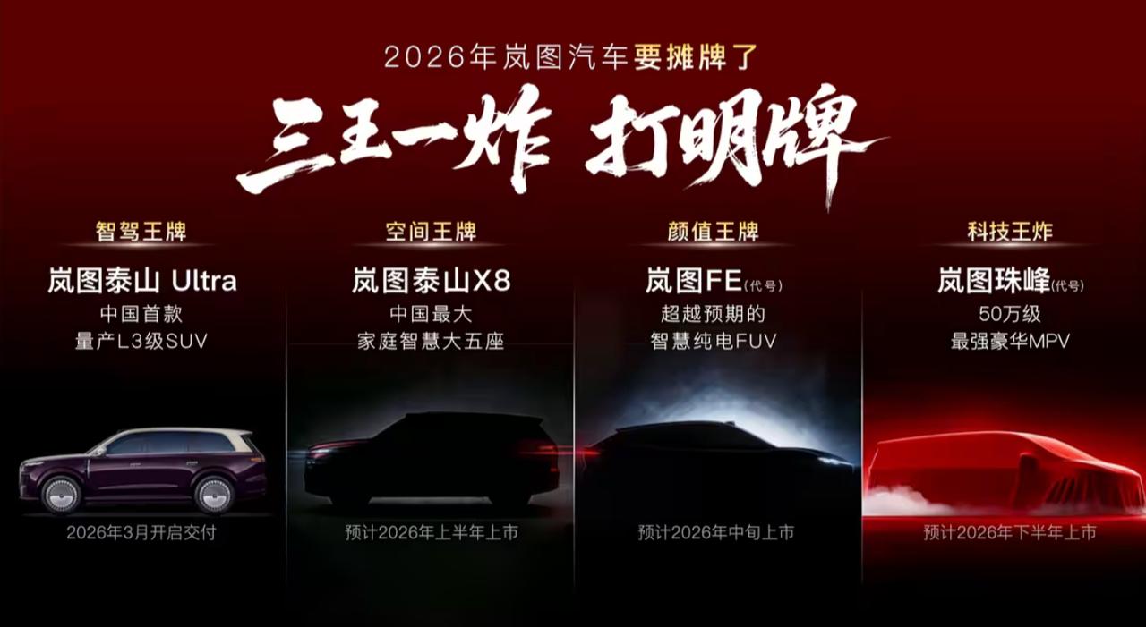 岚图这回打明牌了!26年新车规划出炉 日前,岚图汽车官宣即将在港股上市,并且公布了品牌26年的新车规划,这次岚图真的算是打明牌了。今年岚图将会推出四款新车,总结来说就是三王一炸。 第一张王牌打的是智驾,将推出中国首款量产L3级SUV—岚图泰山 Ultra,搭载了华为乾崑智驾ADS 4 四激光版,硬件能力直接拉满,预计将在3月开启交付。 第二张王牌打的是空间,推出一款全新车型—岚图泰山X8,官方给新车的定位是庭院级大五座SUV,主打大空间和华为赋能的智驾和座舱,预计在上半年上市。 第三张王牌打的是颜值,一款全新的纯电FUV,代号为FE,这是一款主打颜值的车型,预计将在今年中旬上市。 第四张牌打的是科技王炸,一款50万级的豪华MPV—代号岚图珠峰,首发12项黑科技,还是全球首款搭载L3自动驾驶的MPV以及首个拥有超级魔毯的MPV车型,新车预计在下半年上市。 岚图这四款新车你最期待哪一款?欢迎在评论区留言!【来自懂车帝车友圈】