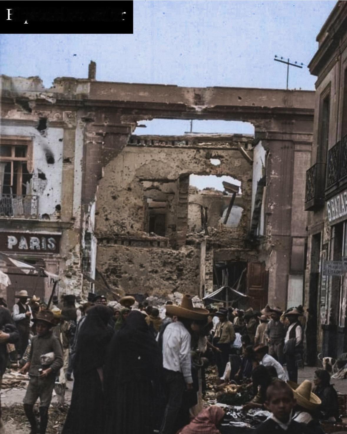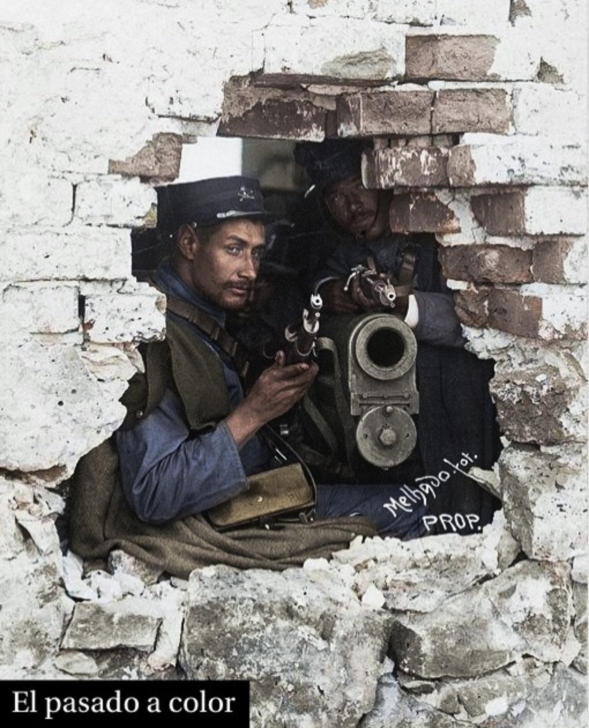 四张来自墨西哥“悲惨十年”(1913年2月9日至19日)的上色历史照片。这场政变由维克托里亚诺·韦尔塔将军和费利克斯·迪亚斯领导,推翻了弗朗西斯科·马德罗总统,导致墨西哥城爆发激烈的城市巷战,造成超过1000名平民丧生。 照片描绘了叛军“费利克斯派”在城堡要塞架设火炮的场景、战后废墟中熙熙攘攘的人群、身着制服的特拉尔潘军事学校年轻学员,以及一名联邦士兵正在使用步枪榴弹发射器——这项技术最早出现在1904-1905年的日俄战争中。