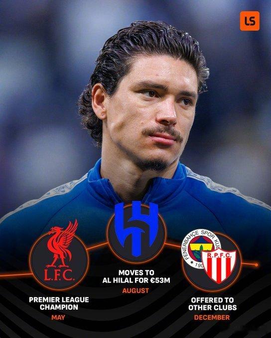 【踢不了联赛】外媒:利雅得新月冬窗签下了本泽马,外援数量超限,主教练西蒙尼决定将努涅斯排除出联赛大名单,但努涅斯依然可以踢亚冠联赛。据报道,努涅斯对本泽马的加盟感到不满,他感觉自己被轻视,一度接近转会土耳其的费内巴切。