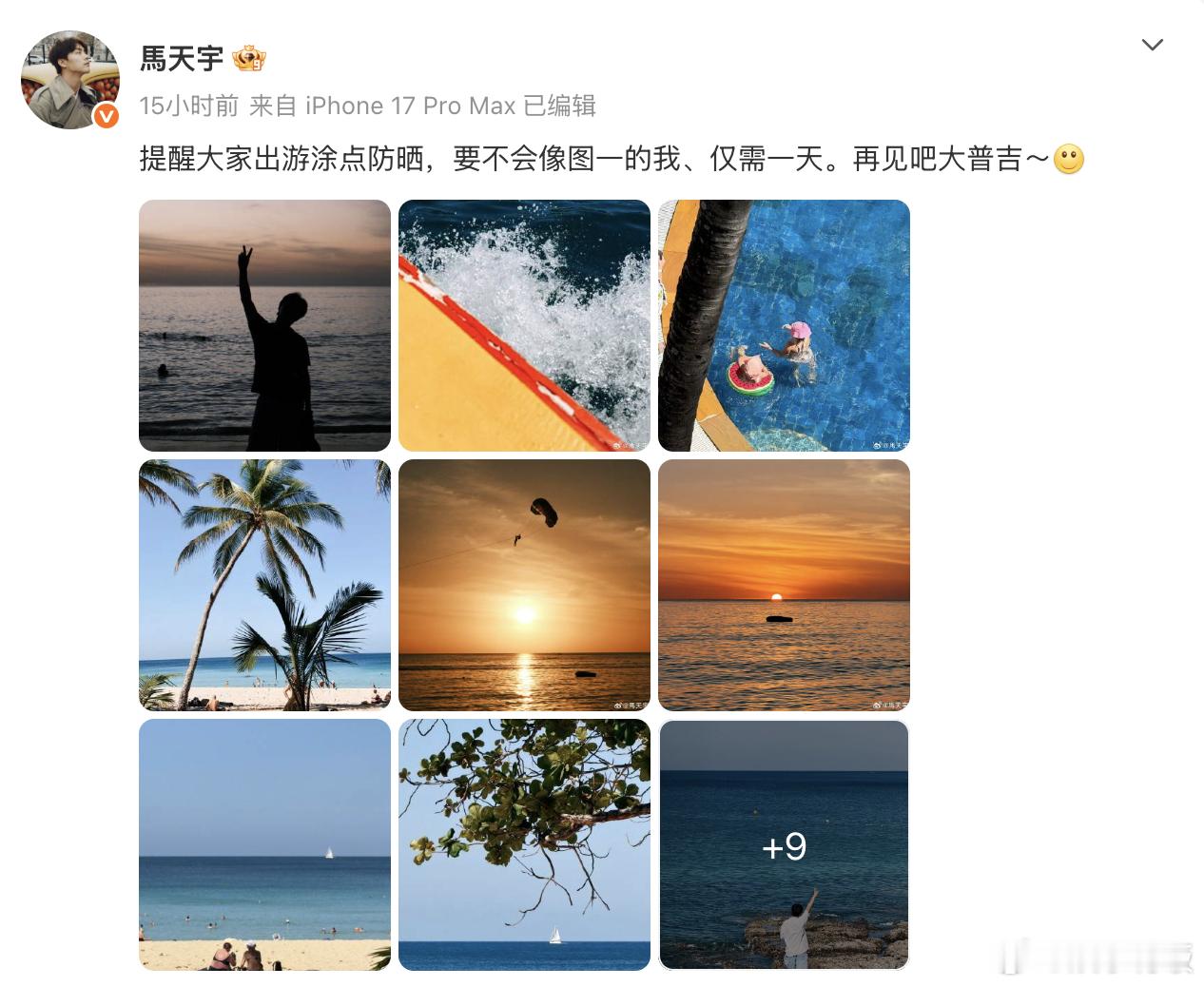 马天宇在普吉岛1天被晒黑 马天宇在普吉岛度假,提醒大家一定要注意防晒,否则会像自