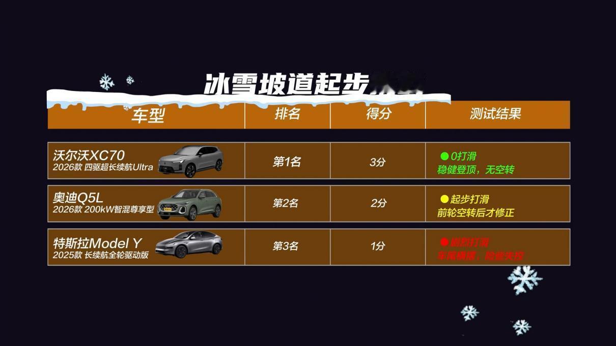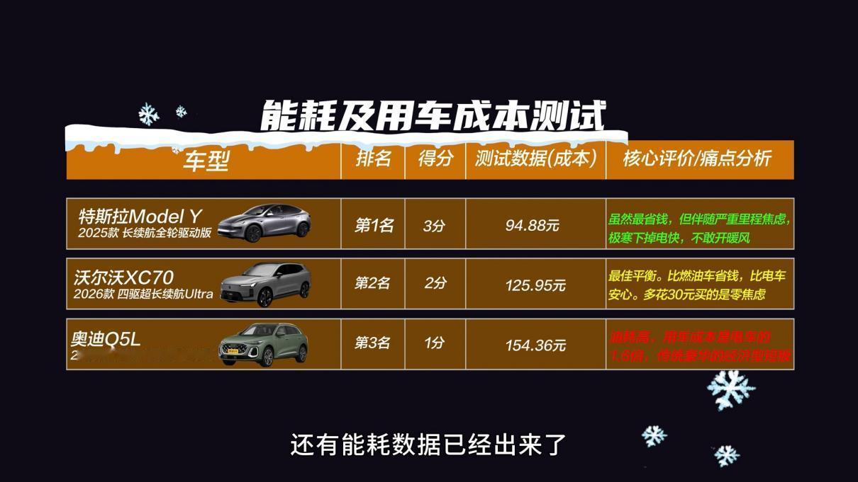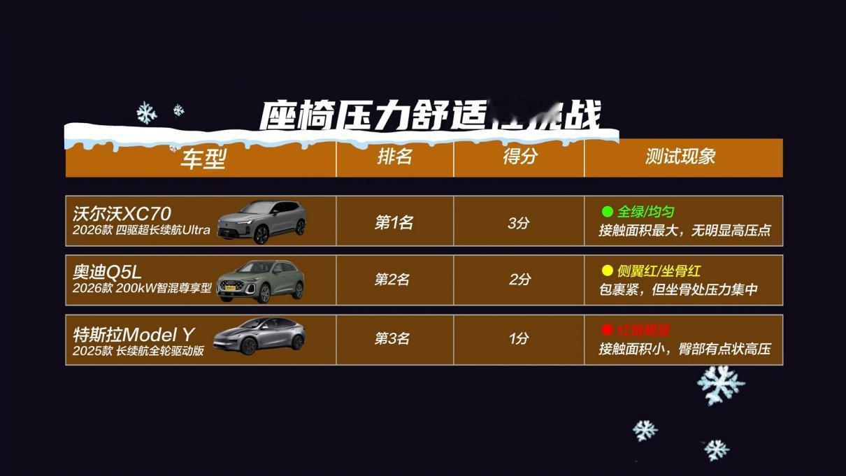 全新XC70成豪华标杆?沃尔沃怎么赢的奥迪Q5L与特斯拉Model Y? 燃油/插混/纯电豪华SUV谁更牛?这个问题,只有放在大冬天的极寒环境下测过了才能回答。不久前,全新奥迪、沃尔沃全新XC70以及特斯拉Model Y就在零下几十度的哈尔滨,来了一次涉及舒适、性能、智能等方面的8项动静态全面测试。 咱们干脆一点来说吧,这回测试最优秀的就是全新XC70,8项测试有7项它都是第一,仅在能耗及用车成本(200km)方面,以30元的差距输给了纯电驱的Model Y。但拥有200km+纯电续航后,它却换来了性能、效能、续航兼顾的无焦虑体验。 当然,通过混动专用发动机搭配P1+P2+P4三电机,全新XC70的四擎四驱七模,让它不仅能无感切换工作模式、实现全速域高效,更做到了输出强劲、抓地有力,这也使得车辆在冰雪坡道起步挑战中,做到了0打滑、无空转平稳登顶。 更重要的是,在动用专业压力设备进行的座椅压力舒适性测试中,XC70不仅有最大的人体触面承托,更做到了“全绿”且均匀,坐垫和靠背非常贴合腿部和背部,是三款车中触面最大、压力最小的一个。这其实当然有无铬鞣全粒面Nappa真皮座椅的功劳,同样也源自于420mm宽大坐垫承托等设计。 当然,全新XC70在舒适方面,还有可变阻尼减震、35处声学包覆盖以及有23扬哈曼卡顿音响参与的主动降噪等支持。我想这不光是它也能在悬架舒适等测试中稳居第一的原因,更是它能够被视为豪华插混标杆的底气。【来自懂车帝车友圈】