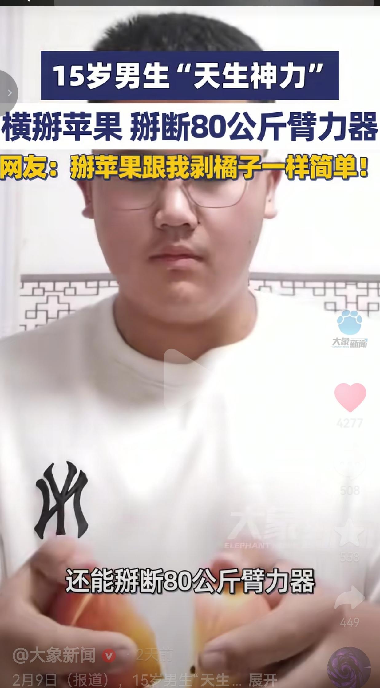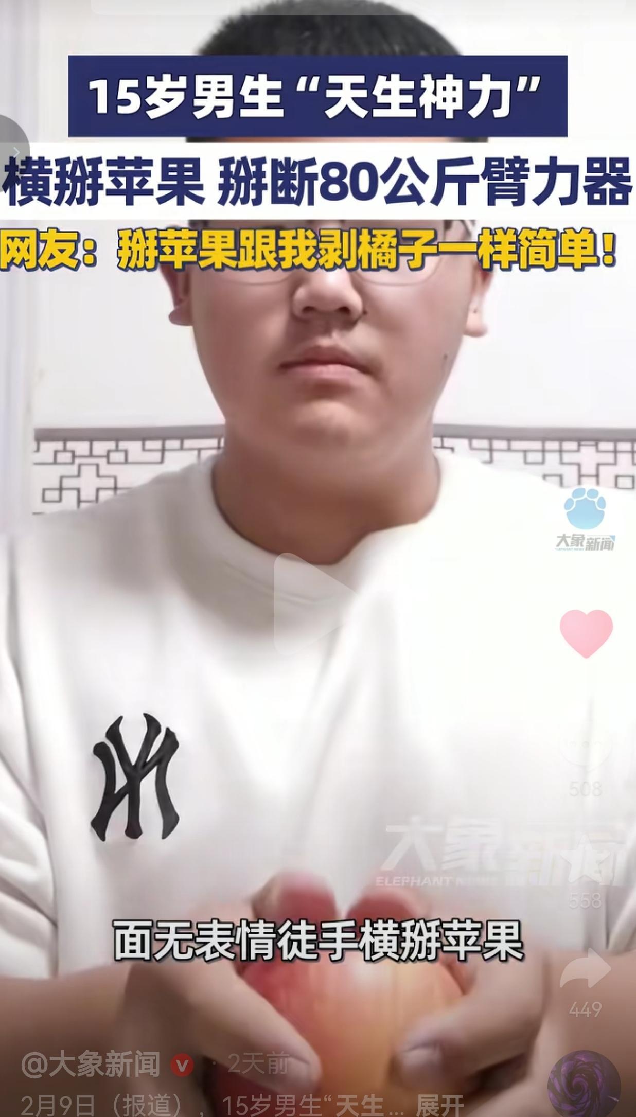 最近,辽宁一个15岁男生徒手掰苹果、掰断80公斤臂力器的视频刷爆了全网。 视