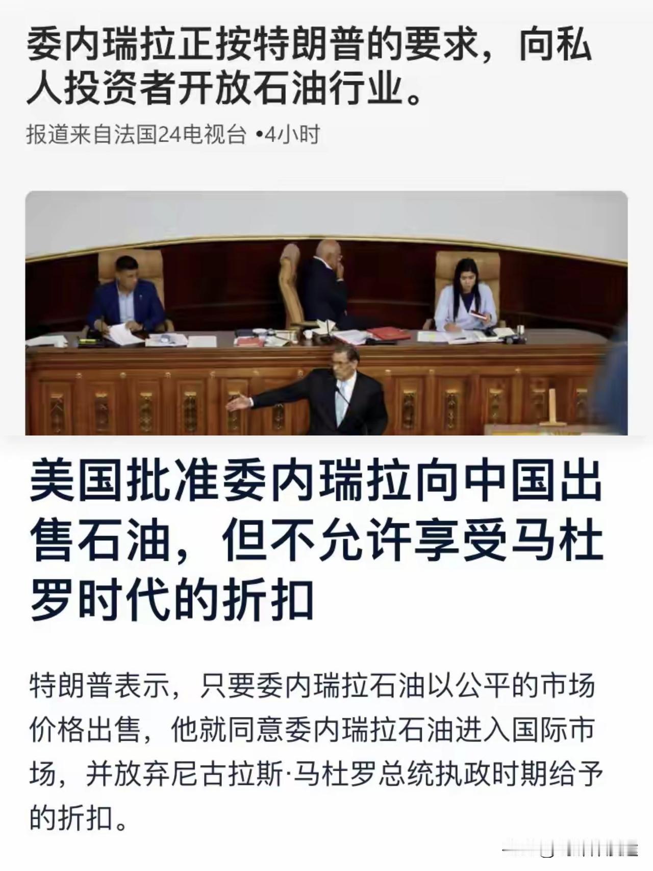 听了委内瑞拉代总统对美国发言后,感觉马杜罗被掳走之事件委代总统起了不简单作用! 美能源部长到委内瑞拉考察石油,与委代总统会晤;委代总统曾表示:委内瑞拉人民挺过来了,我们不害怕与美国建立关系,将与美分享石油收益! 委内瑞拉代总统很明确表明 将自己国家石油资源利益 与美国共同分享,这与美国特朗普的言行一致。所以罗德里格斯能成为美国政府支持的“代总统”! 委代总统的做法与马杜罗完全是相反,马杜罗关了许多政治犯,代总统基本上全部释放。马杜罗将国家石油国家化管理,代总统改革私有化,同时让美国巨头参与,并与美国政府共同分享石油收益! 委代总统这样的言行举动,已是完全配合美国政府的指令,而对于马杜罗为何被这么轻易的掳走,这里面不言而喻 代总统出力了!
