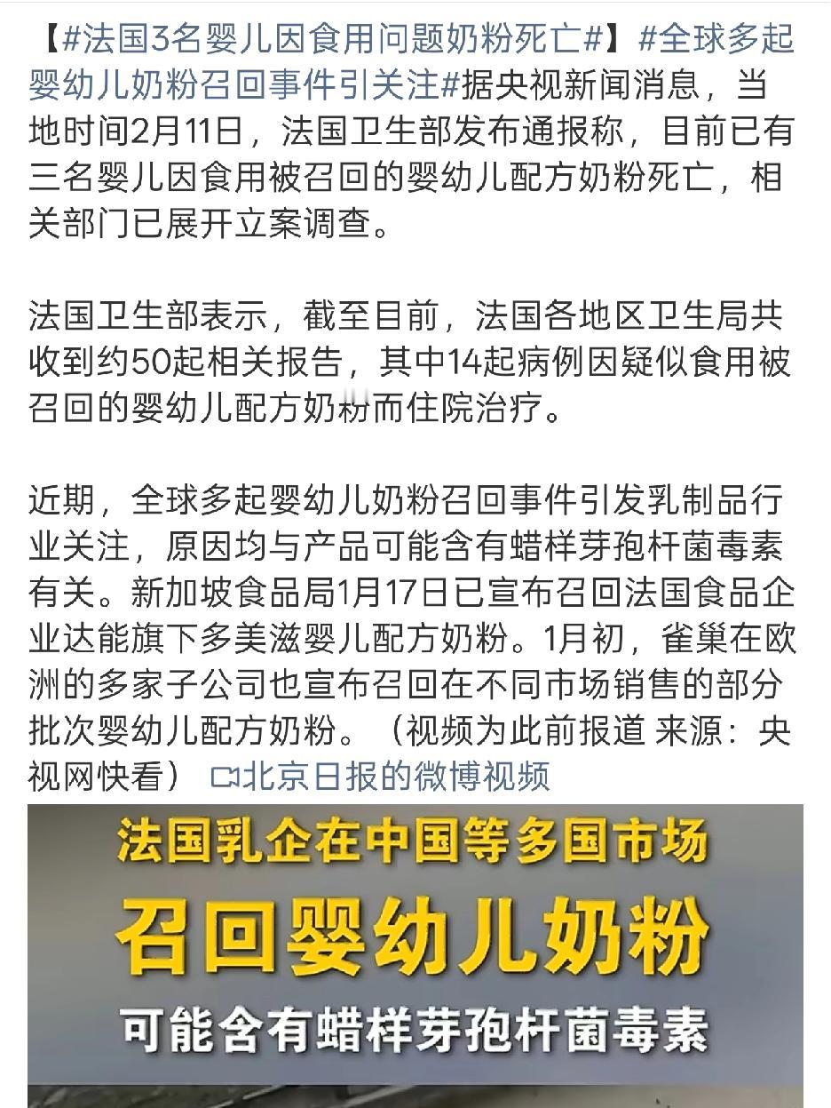 太令人痛心了,法国三个婴儿因为吃了问题奶粉死亡,而且好像十几个吃了问题奶粉出问题住院的。 我拜托这些资本家的魔爪离这些小孩子远一点好吗?这和当年的“三鹿事件”有什么区别,我记得今年1月份,就有不少的奶粉召回事件,把奶粉做的安全没问题就有那么难吗!要是能把食品安全问题,着重处罚,我就不信还有人敢这么做!