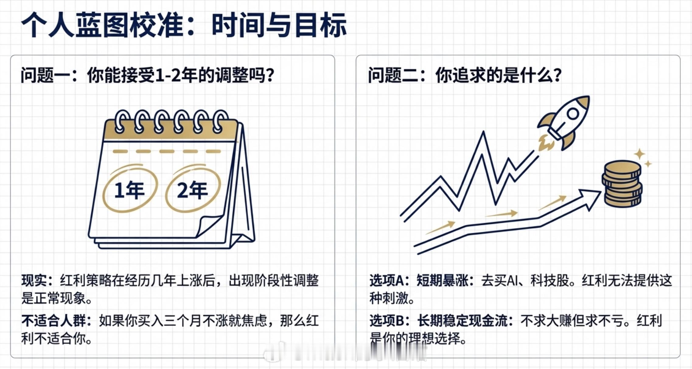 第一,你能接受1-2年的调整吗?红利已经涨了好几年,现在调整一两年是再正常不过的事情。如果你买进去三个月不涨就想跑,那红利不适合你。第二,你追求的是什么?如果你追求的是短期暴涨,去买AI、去买科技。红利给不了你这种刺激。如果你追求的是长期稳定的现金流,不求大赚但求不亏,那红利正适合你。