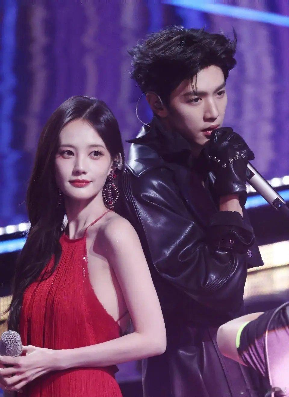 舞台上李一桐一身红裙摇曳生姿,陈哲远黑色皮衣尽显张力,本来是红与黑的经典组合。