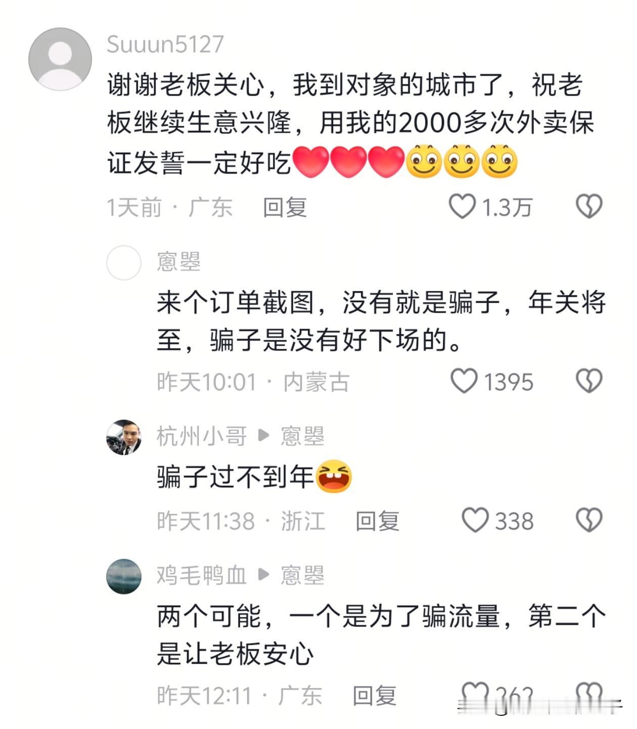 5年在同一家餐馆点单2000多次的顾客找到了!有人在老板的视频下留言,解释说他去年找对象了,为了方便和女友在一起,他已经离开佛山快1年了,所以才没有点外卖。 目前暂不知道真假,也不知道这位网友是不是那位顾客,可能是来“捣乱”的,也有可能是为了让老板安心,故意这么说的。 有网友说,老板是觉得失去了一个固定的顾客,才这么说的,不然都点单这么多次了,为什么没有加个联系方式,等顾客不点单了,才想起找对方。 也有网友说,他相信老板也是出于关心,毕竟5年点单2101次,相当于每天都要吃老板做的饭,也是对老板手艺的认可,也不可能在乎这一单生意。 不管咋样,这条留言也算给了老板一丝安慰吧,希望这位老顾客平平安安就好!