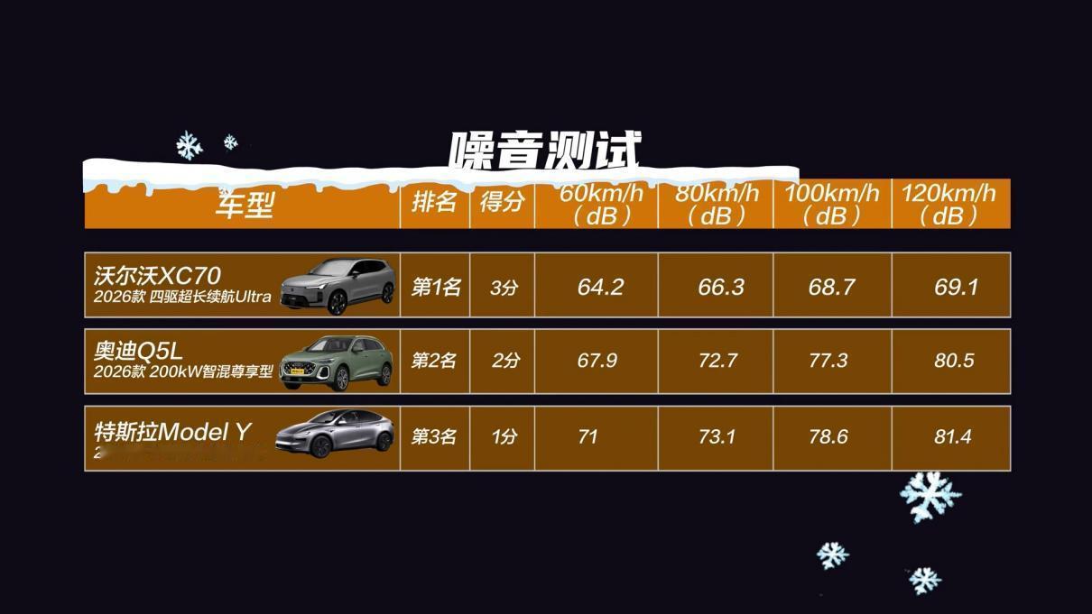 极寒测试检验豪车全面性:沃尔沃全新XC70连泊车都是第一? 你说现在一台豪车,没有点儿电气化,不拥有点儿智能化的本领,真谈不上是真豪华。你就说Model Y称得上是智能方向上的同级佼佼者,而全新一代奥迪Q5L就是不插电,也尝试用HDI技术来兑现一些电气化能力。而这两款车,最近就跟沃尔沃全新XC70一块儿,完成了极寒天气下的一次全面豪华测试:  能看到的是,三款车都完成了低温冷启动、冰雪坡道起步、悬架舒适、能耗及用车成本等八大测试,其中,SMA架构上打造的全新XC70就在6项客观项目中占据头名,而Model Y也在能耗及用车成本中以全程纯电优势占据第一。通过35项声学包覆盖、标配可变阻尼减震以及四擎四驱布局,全新XC70实现了全速域噪音最低、多场景路测最平稳。 而在涉及智能化的自动泊车测试中,Model Y由于需选装所以没有参与测试,而比起全程没有提示音的Q5L,全新XC70却做到了全程提示跟进,无论是启动、识别、操作等等都有全程详尽引导。关键是,车辆在横纵方向上都做到了10秒识别车位、加减速与制动都保持了合理线性,从开启到停稳全程不过1分多钟,这全新XC70在智能化上跟新势力是真没差。 能在这极寒天气下,从静态到动态,再到智能体验都保持豪车应有的表现,沃尔沃全新XC70这回是真用实际表现说明了什么才是豪车应有的全面。【来自懂车帝车友圈】