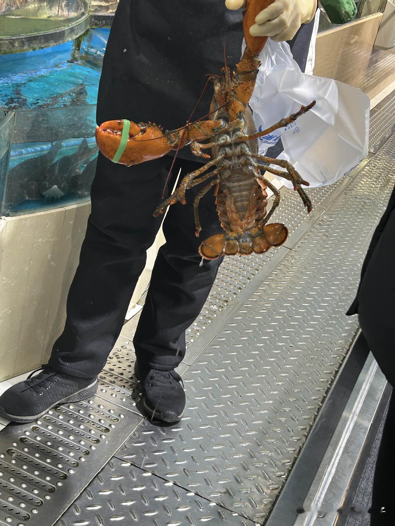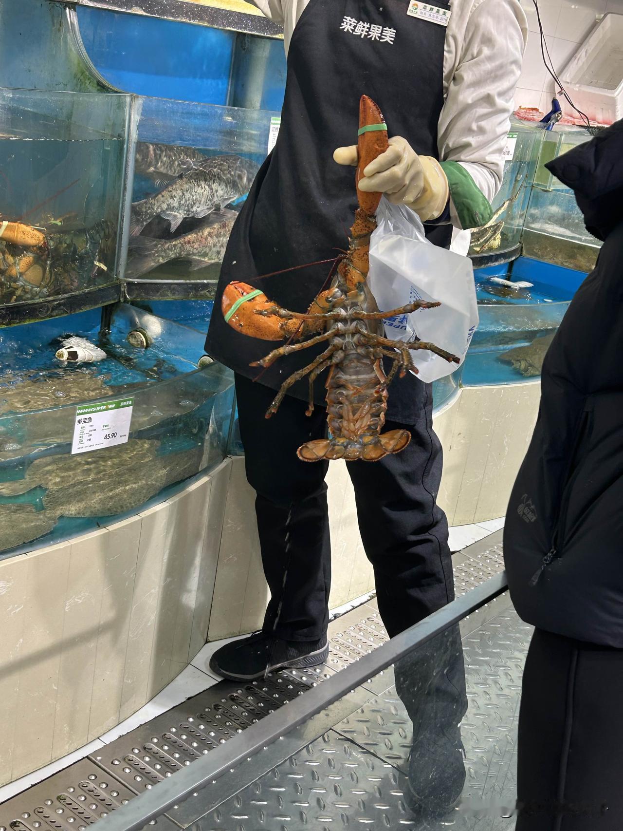 马上要过年啦! 要开始准备年货了! 看看这只大龙虾,波士顿大龙虾, 这只虾要1000元一支,贵不贵? 两只大钳子很厉害的!