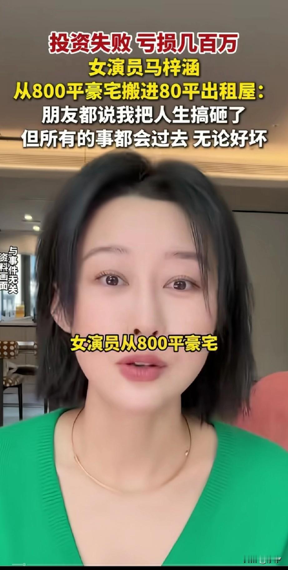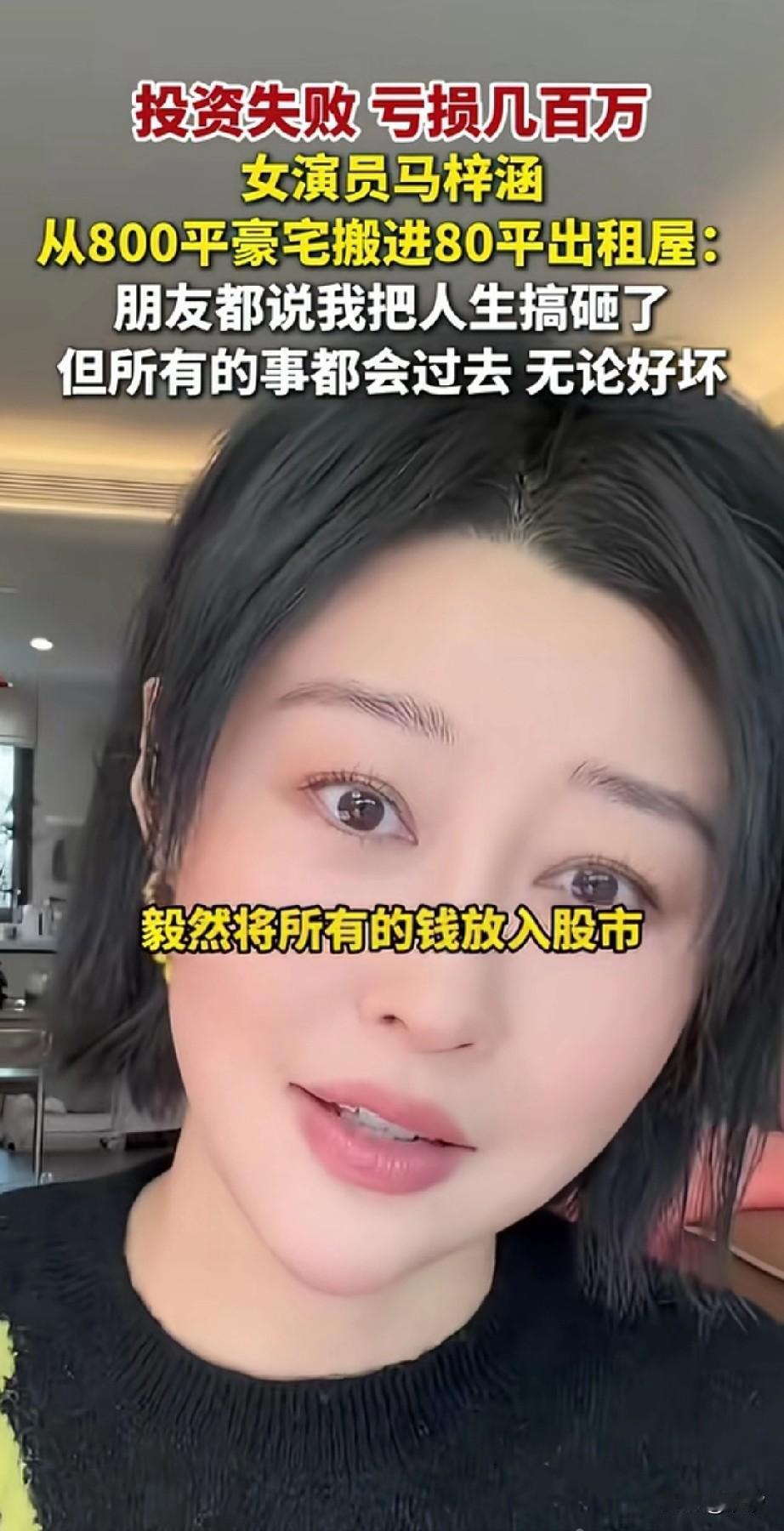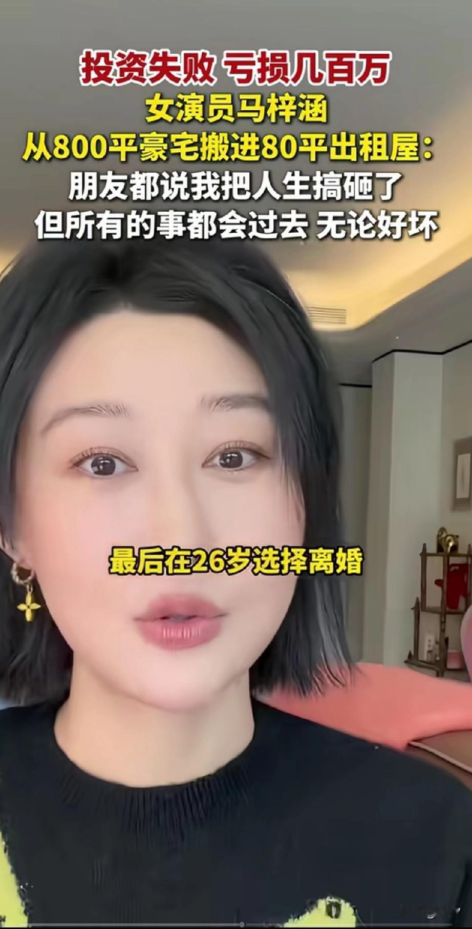 女演员马梓涵最近火了, 她自曝婚前的人生就像开了挂, 22岁在事业上升期的时候选择隐婚, 并且退出了娱乐圈, 后来感情也破裂,离婚了, 作为投资小白的她将全部资金投入到了股市,没想到投资失败, 亏损了几百万, 硬生生的从800万的豪宅搬到了80平的出租屋,不过她仍旧不凄美, 如今再次开启了博主生涯, 凭借自己明星的身份想要逆风翻盘, 自己爆料自己的隐私获取流量, 效果也是出奇的好, 人不仅再次火了, 而且也吸引了大批的粉丝, 她的朋友都说他把人生搞砸了, 但她却说所有的事情都会过去,无论好坏,这样的人心态是真的好! 她说的一点都没有错, 相信凭借她的努力会再次一飞冲天! 大家对于女演员马梓涵的爆料怎么看? 娱乐圈那点儿事 女演员