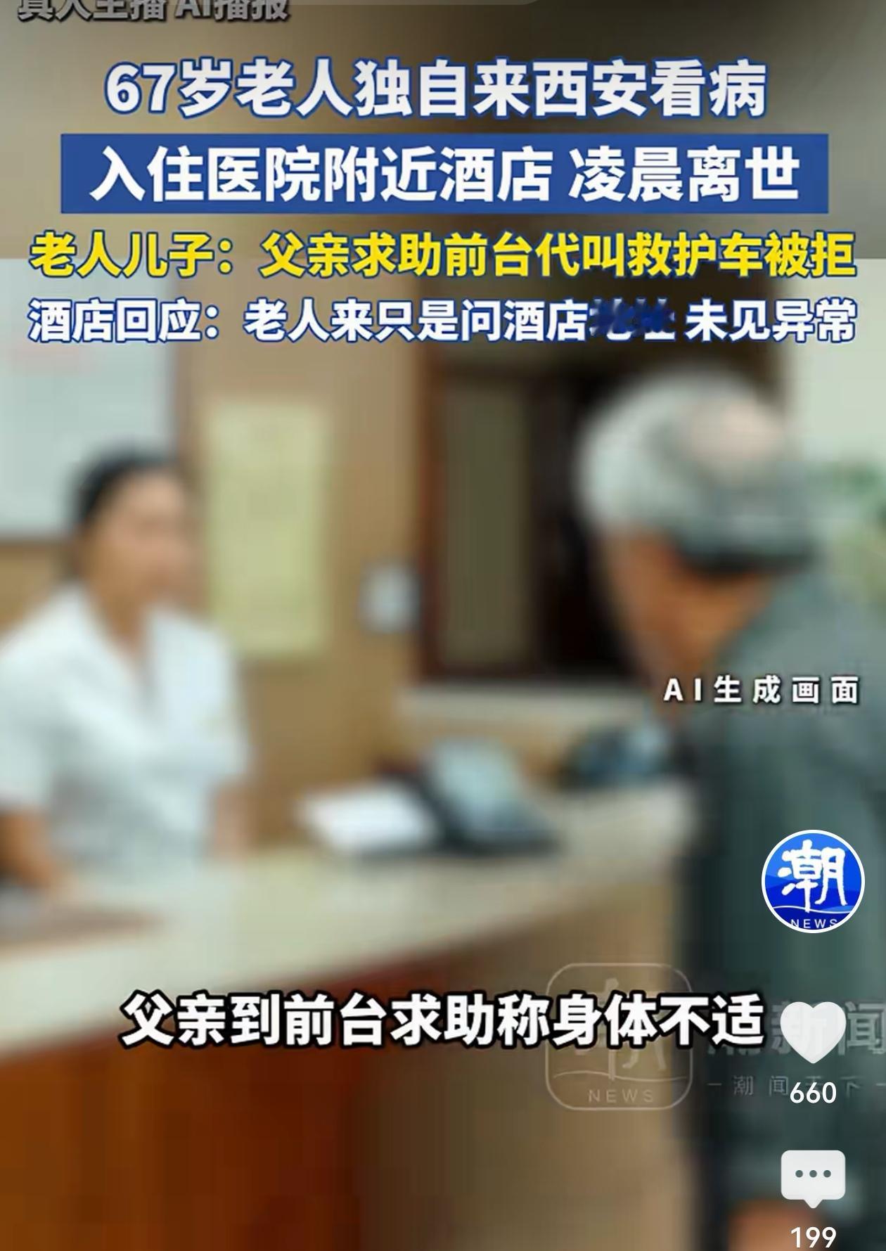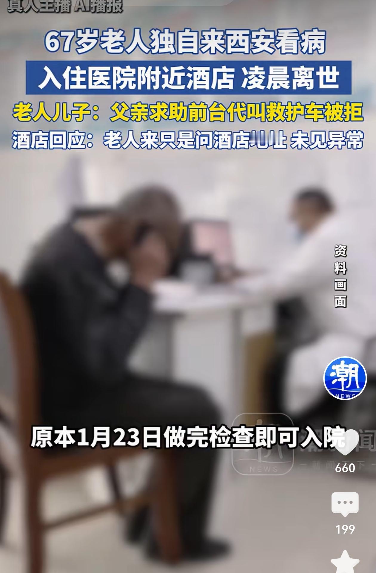 “冤不冤?”山西,老人去西安看病,在医院附近租住每日40元的公寓,三日后凌晨五点,他请前台帮忙拨打120被拒后,死亡。家属查看监控后,认为酒店延误救治,但工作人员却说,老人根本没让帮忙。 那张动态心电图报告单上的曲线,在1月23日凌晨5点47分变成了一条令人窒息的直线。 这不是发生在ICU重症监护室,而是在西安兴庆北路一家日租金仅为40元的公寓酒店里。67岁的山西退伍老兵霍师傅,身上带着好不容易凑来的3万元住院费,却因一通未能拨通的求助电话,不幸离世。 在这座拥有千万人口的现代化都市里,从求救到死亡,中间横亘着致命的五个小时真空。 霍师傅不是流浪汉,他是医疗资源挤兑下的“编外患者”。因为大医院床位紧缺,他被安排在“预住院”的等待名单上。为了不给远嫁西安的女儿添麻烦,也为了省下每一分钱用于治疗严重的心衰和房颤,他避开了女儿家,独自住进了这家专门做病人生意的廉价公寓。 40块钱一晚的房费,买不到星级服务,但谁也没想到,连作为“人”的最基本底线都买不到。 悲剧的扳机在凌晨3点被扣动。严重的胸痛和无力感袭来,这位曾穿过军装的老人,忍着浑身水肿的剧痛,一步步从房间挪到了酒店一楼前台。这是一场关于生存的最后突围。 但他被挡在了一道看不见的墙面前——技术与冷漠构成的双重高墙。 老人手里攥着一部新买的智能手机。对于习惯了老年机的他来说,此刻那块漆黑的触控屏就像是一个无法破解的迷宫。他颤抖着请求前台那位年轻的夜班店员:帮忙打个120,或者告诉他具体的地址。 这本该是举手之劳。但在监控记录不到的声音里,店员给出了一个近乎荒诞的理由:“没打过,不会打。” 这句话像一把刀,切断了霍师傅与生门的最后一丝联系。店员不仅拒绝代拨,还要求老人自己联系家属。在那个寒冷的凌晨,监控探头无声地记录下了最残忍的一幕:求助无果的老人,带着满身的病痛和绝望,无奈地转过身,在这个世界上留下了最后一个落寞的背影,慢慢挪回了那个空气稀薄的房间。 这一转身,就是永别。 这是一场罗生门式的辩解与对质。事后,酒店方轻描淡写地回应,老人当时“未见异常”,只是询问地址,并未要求代打。然而,家属眼中的监控视频却是另一番景象:老人的体态痛苦,求助意图明显。 更令人脊背发凉的是那段消失的时间。从凌晨3点老人上门求助遭拒,到清晨8点工作人员交接班,整整五个小时,前台既未拨打内线核实情况,也未曾上楼查看一次。 这里住的大多是来附近医院看病的外地患者,其中重症、癌症病人尤为常见。经营者心知肚明,这里实质上是医院病房的“廉价延伸区”。但在法律与道德的审视下,他们对这群高危人群表现出的注意义务,甚至低于普通旅馆。 直到早上8点,接班的工作人员才拨通了霍师傅女儿的电话。女儿在电话那头焦急地嘶吼:“快去房间看!快打120!” 当工作人员终于敲开房门时,死寂早已降临。 8时13分43秒,西安市急救中心才接到这家酒店打来的求救电话。这通迟到了5个小时的电话,距离霍师傅医学死亡时间05:47,已经过去了两个半小时。 救护车仅一分钟便抵达现场,医护人员冲进屋内,只见对方瞳孔已散大固定,生命体征完全消失。那张原本为了治病救命的3万元银行卡,还静静地躺在他的衣物里,变得毫无意义。 霍师傅为了省钱,为了不麻烦女儿,小心翼翼地维护着自己的尊严,试图在这个庞大的医疗体系边缘寻找一线生机。他越过了心脏起搏器手术的难关,扛过了心衰的折磨,最后却在一名身心健全的年轻人面前,输给了一句冷冰冰的“不会打”。 在这座城市逐渐苏醒的早晨,40元的廉价公寓里,一个老兵的生命刻度被强行归零。这不仅是个体的悲剧,更是智能化浪潮下,无数被困在“数字孤岛”上的老人们,面对社会温情缺失时,一次无声且惨烈的坠落。 参考信息:大象新闻.(2026-02-11).山西一67岁老人入住西安一酒店凌晨离世,曾求助前台代叫救护车被拒?酒店回应:老人来只是问了酒店地址,未见异常。