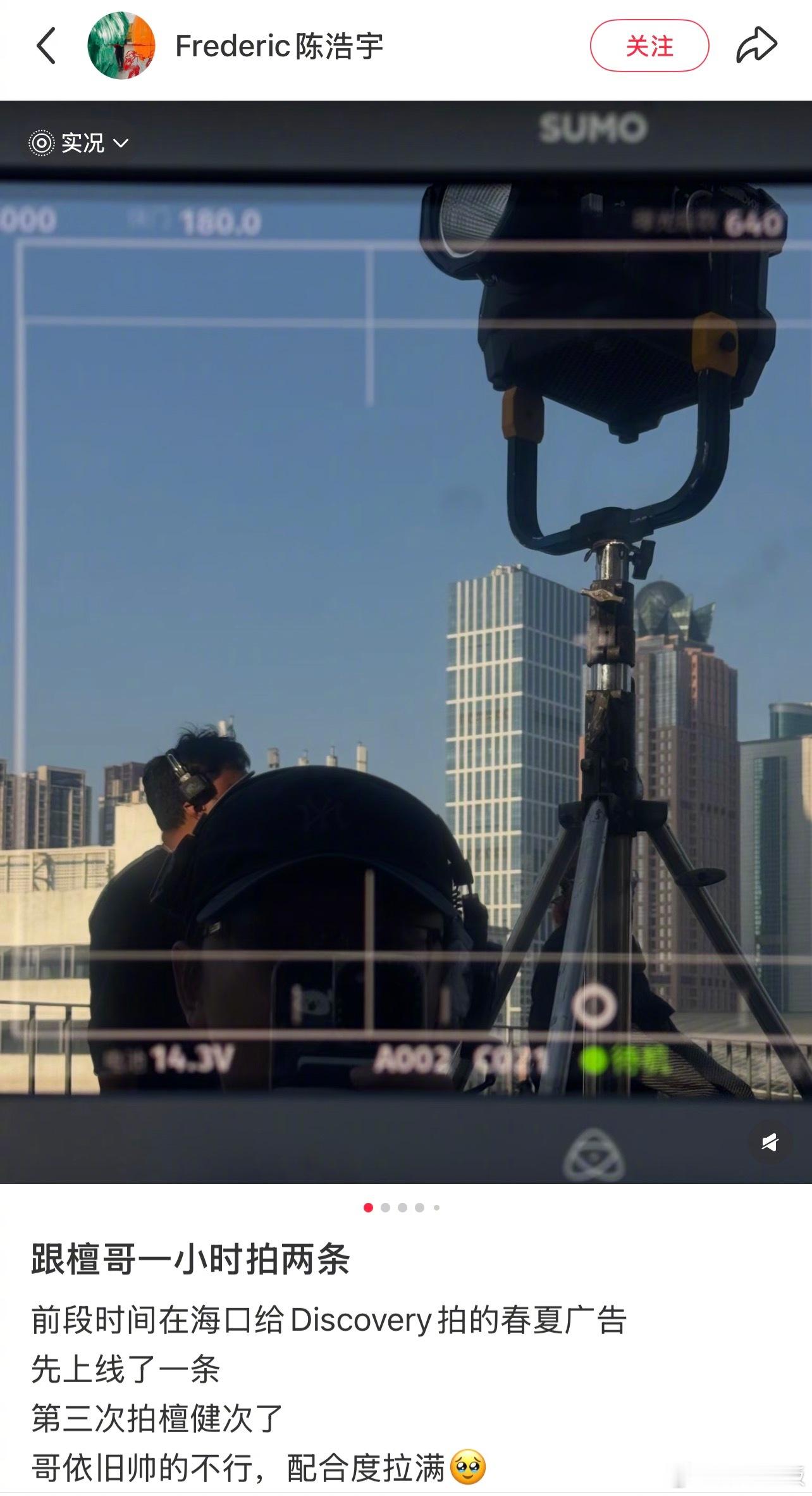 摄影师曝檀健次拍摄几乎一条过摄影师夸檀健次非常敬业 📸 摄影师Frederic陈浩宇晒出的拍摄幕后,直言拍摄效率超高——一小时拍两条,每个镜头几乎一条过,极少数才拍两次。因为檀健次下午另有行程,团队全程高效配合、速战速决,摄影师也大赞他状态在线、专业度拉满檀健次