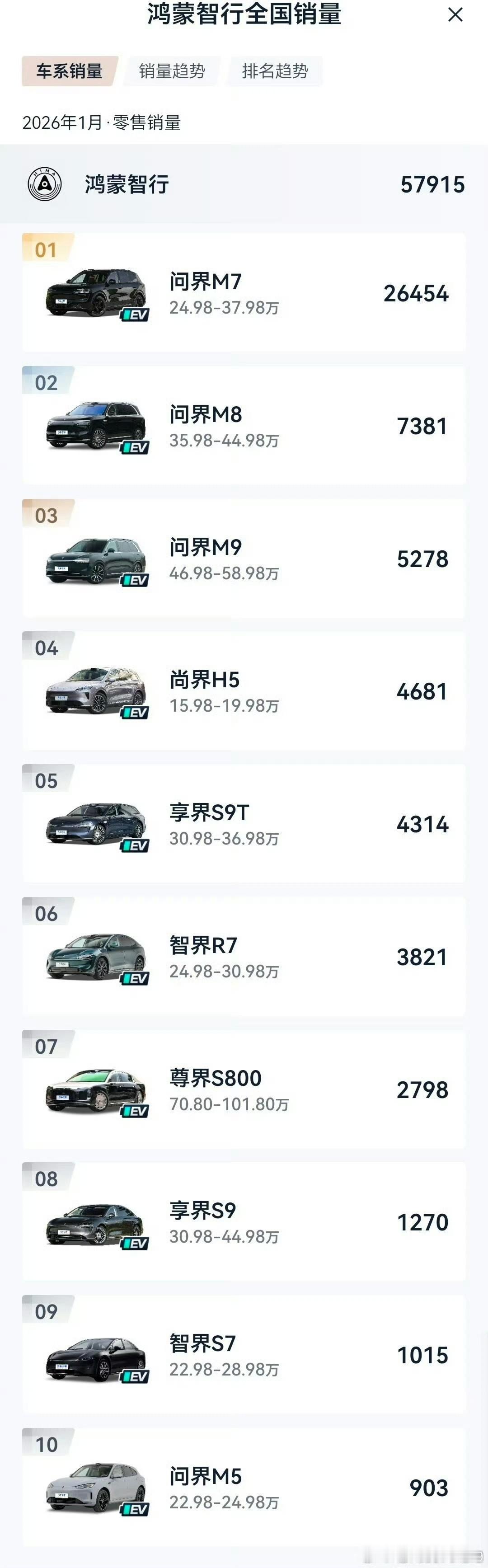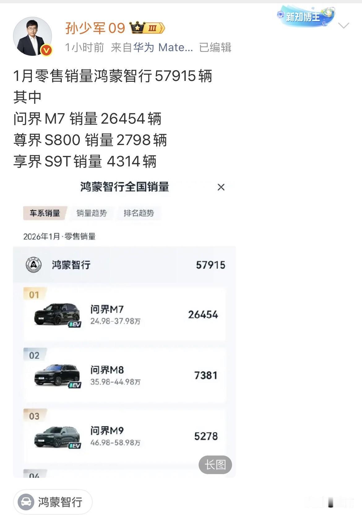 孙少军: 鸿蒙智行1月零售销量57915辆! 就在刚才,孙少军放出了上个月鸿蒙智行的零售销量,卖得最好的是问界M7 ,差不多占了这个销量的一半,卖出了26,000多台,要知道这个车稍微把配置拉高一点点,全部办下来都差不多40万了! 依次往下面分别是问界M8和M9,分别卖出去了7300百多台和5200百多台,这两个车的秩序也是越来越贵的,40多万出头50多万出头,这种级别的车,在一月份所谓的单季能够卖出这个成绩,其实早就超越了奔驰宝马奥迪。 而且现在M9也快要改款了,在这种情况下,每个月还能够维持超过5000以上的销量,这是一台50多万的车,已经出来有一段时间了,现在这个车二手市场的价格不但依旧能够扛打,关键是新车也依然受欢迎。 当然,大家最关心的还是尊界,在上个月是淡季的情况下依然卖出的2700多台,这玩意儿可是正经的百万豪车,而且出来也快一年了,能够保持这个数字,在同级别的豪车里面,不说是没有对数的存在,但这个成绩真的非常难得。 当然把眼光放开,一月份卖得最好的新能源是小米SUV,卖得最好的综合品牌居然是大众,这一点确实有点意外。