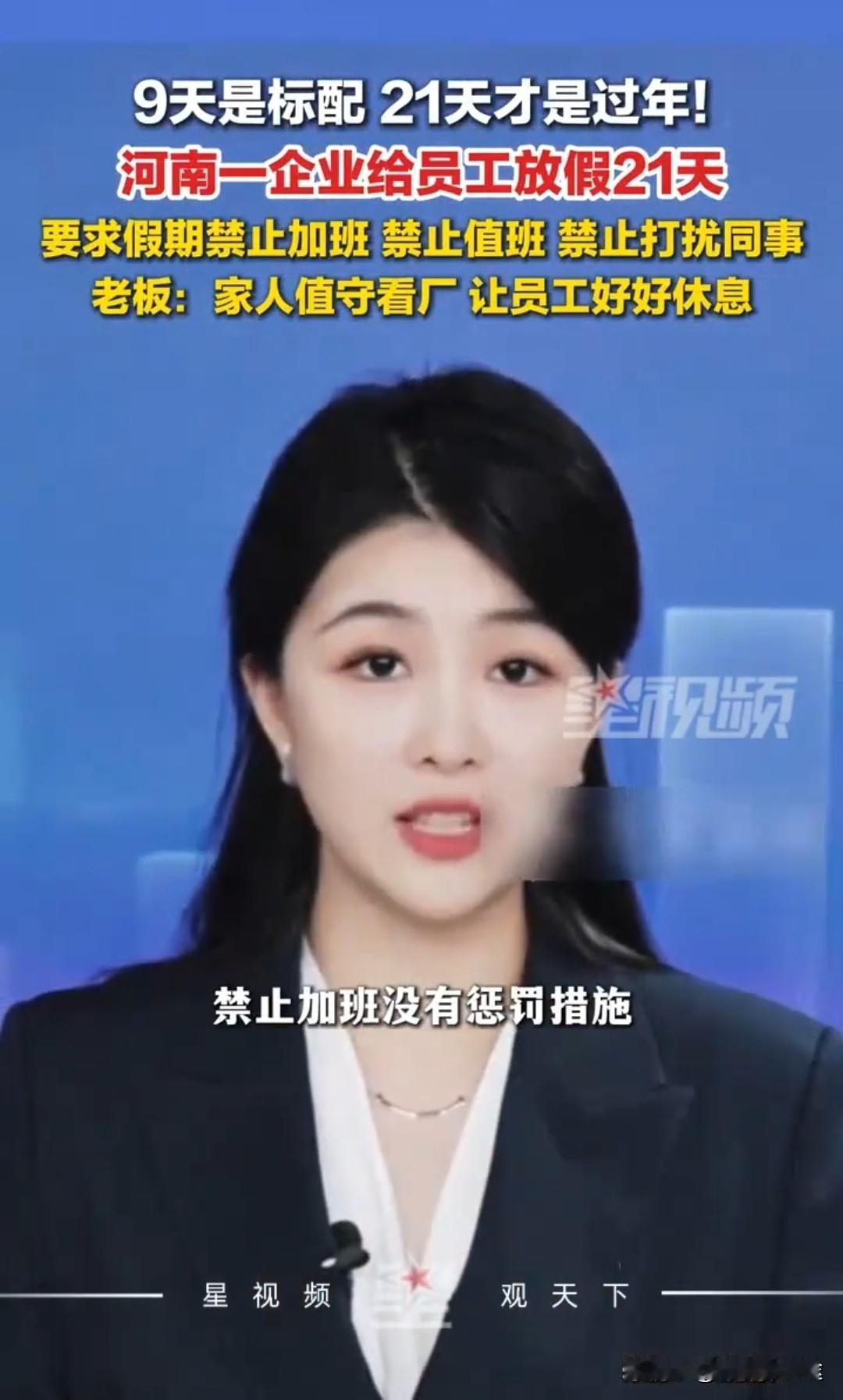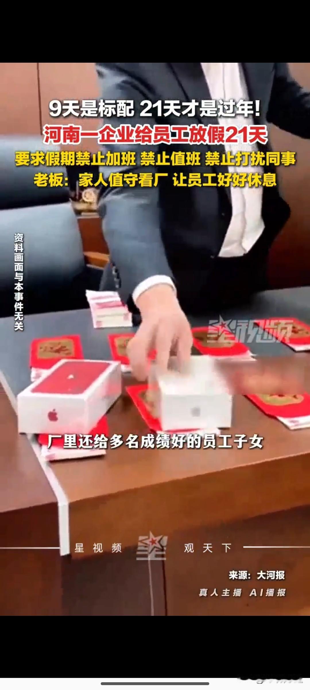 过年就是要“喝好 吃好 玩好”21 天假期:禁止加班 禁止打扰!这是河南洛阳一家企业的老板的规定! 这家企业是饮水行业的企业,企业 2025 年的效益也很不错,为了表示对工人在这一年内努力工作而付出的劳动,以 21 天的假期给到了员工,让员工有更多的时间陪陪家里人,开心快乐的过年。 这样的好企业也真的为之点赞,对于企业来说,通过这种有兜底的放假方式 让员工有更多的时间休息好 陪好家人 开心快乐的消费,这对整个社会来说也是有好处的。毕竟过年就一年一回,有家里的亲人们更加期待有更多的时间在这样一个欢快的节日里一起开心快乐。这对企业一个大家来说,还有对员工个人的小家来说都是一个很强的动力。让家庭开心快乐圆满,同时为年后的企业发展动力也注入了新的活力。过完年后,充分休息好的员工 将以更加饱满的热情与激情投入工作 提升企业的活力与效率 让 企业在新一年更加快速的发展,而员工也正期待下一次过年的快乐时光。 所以说,企业老板这一点还是很有前瞻性的,虽然多放假了几天,企业老板有底气 更不会太看重多放假几天的生产损失,而更多的寄希望休息好的员工回公司更加有动力与活动投入工作,将因放假而耽误的订单 “抢回来”!这是一个真正有思维的企业管理者:向员工要效率 向企业要质量!