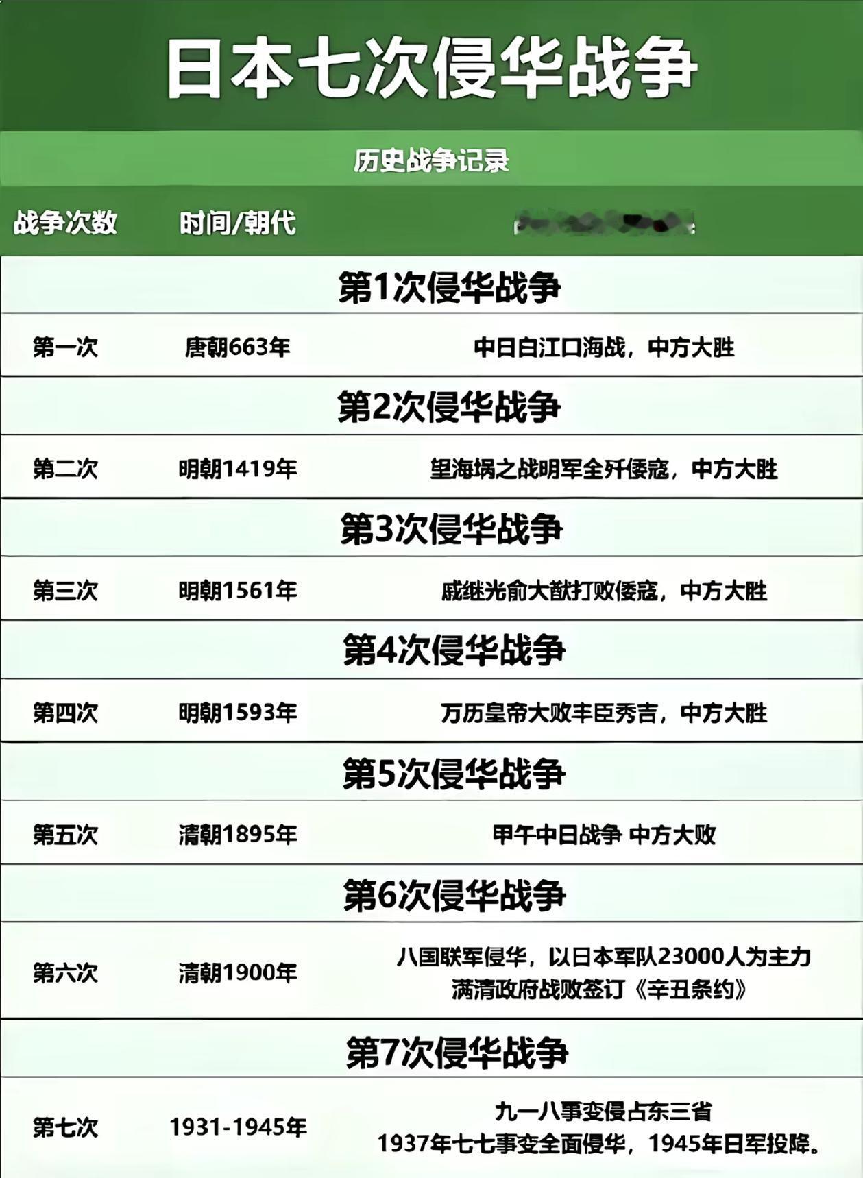 日本七次侵华战争! 从唐朝的白江口海战开始,日本一直就赌国运,用以小博大的方法,知道中国不会灭掉日本,顶多输了就俯首称臣,缴纳上贡,白江口海战前日本就派遣了四次遣唐使来中国,知道中国的强大,但是还是发动战争来博取利益,输了后,第五次派遣遣唐使来中国,才俯首称臣,但从明朝开始又继续发动侵华战争,在沿海烧杀抢掠无恶不作, 日本这个国家,不会感恩,眉强欺弱,甚至经常赌国运,向大国发动战争来获取更多利益!