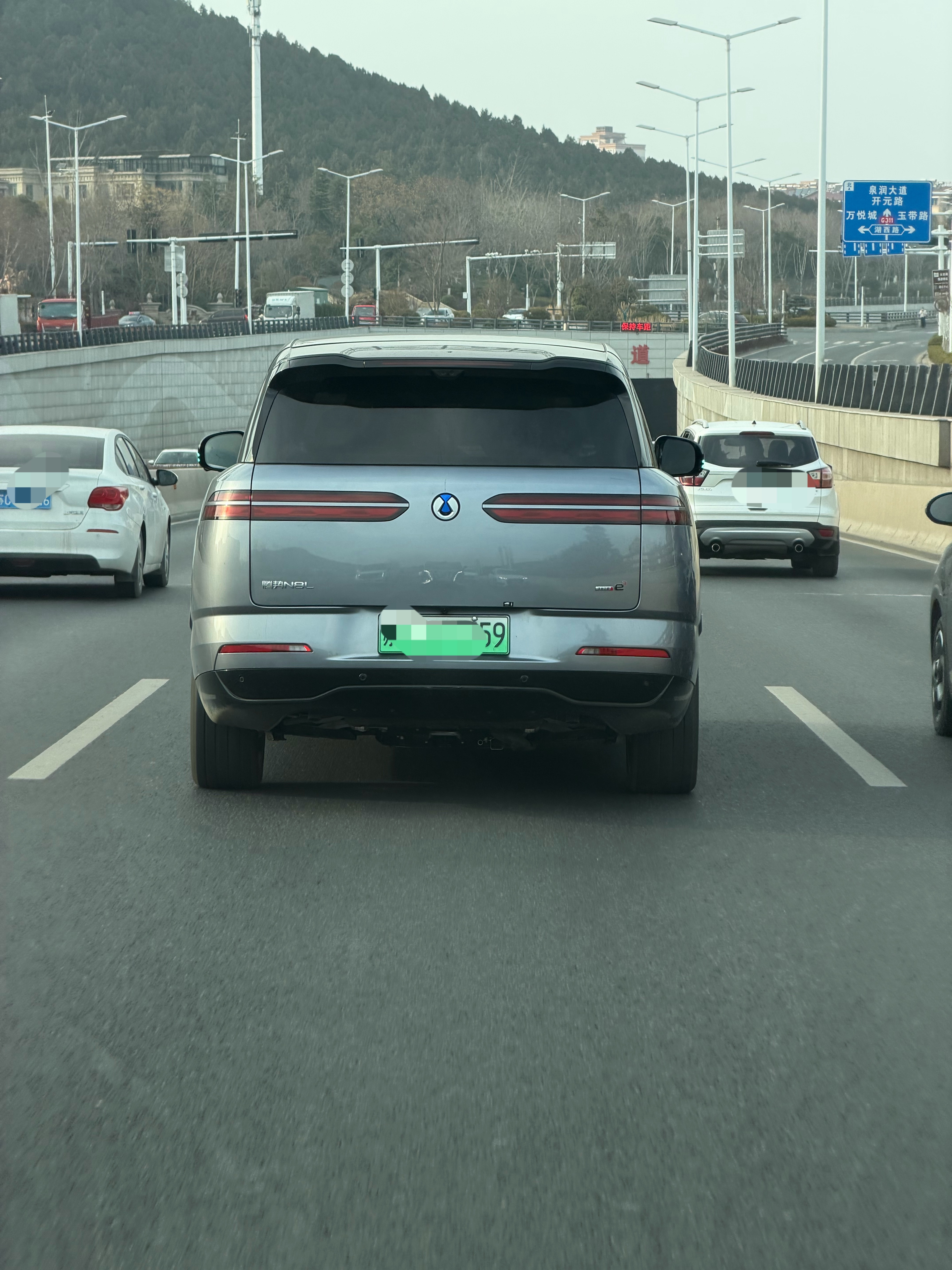 路上遇到一辆腾势N8L,智驾小蓝灯开着,有品~