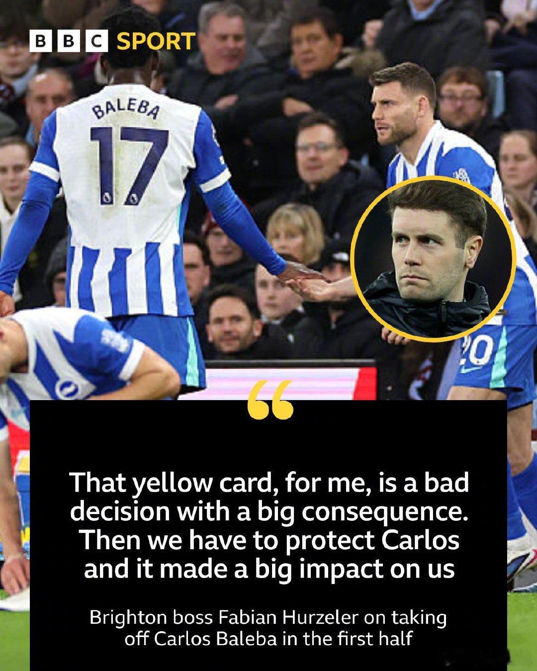 【保护性换下】布莱顿中场巴莱巴在对阿斯顿维拉的比赛中吃到黄牌,第22分钟就被换下,主教练许尔策勒表示这是为了保护球员:“裁判的黄牌绝对是错误判罚,这不是严重犯规却给了黄牌。我必须保护巴莱巴,这是换下他的唯一原因。我在英超联赛中见过无数次这样的犯规,99%的情况下你不会出示黄牌,因此我真的很不理解。”英超