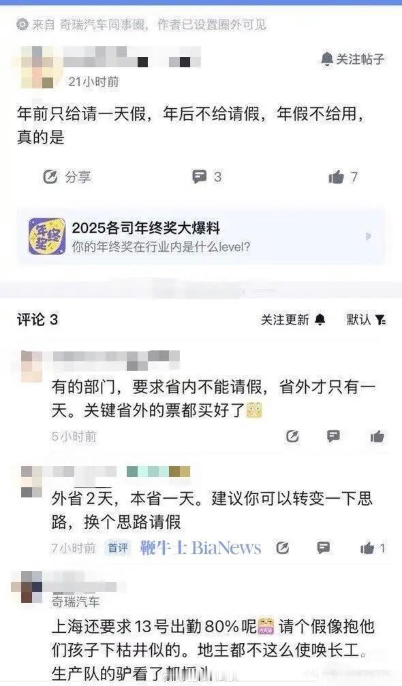 奇瑞员工吐槽:年前仅一天假,年后不让请,年假不给用