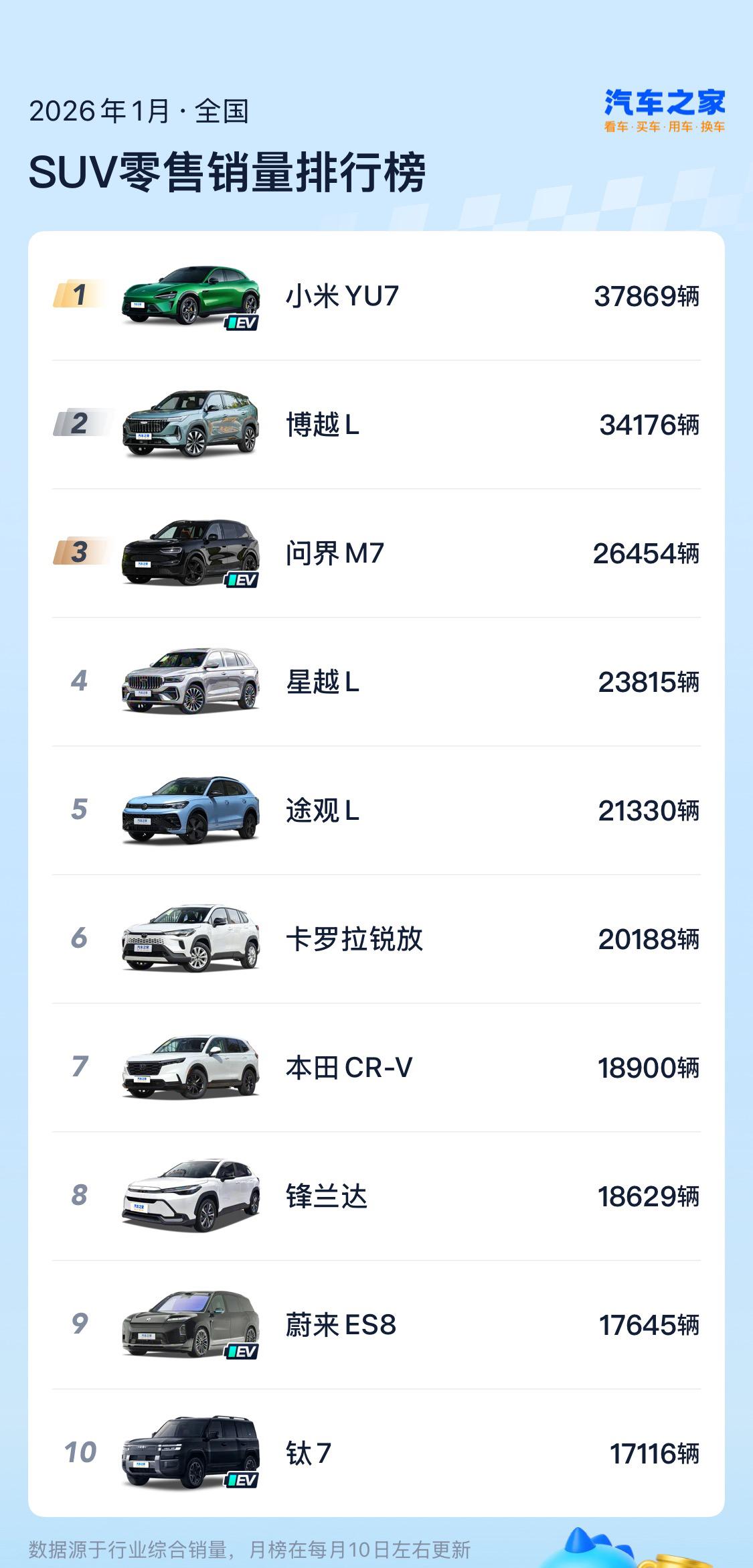 2026年1月份汽车销量终于出来了!受购置税影响电车节节败退?[震惊][震惊][震惊] 尤其是轿车市场!不限定任何条件,轿车前10名就1款星愿是电车,其余全是油车![笑哭]中型车市场,前10名全是油车? 中大型车市场,前10名前三都是油车:BBA的56E,第四才是电车,但是销量远不如第3名,前三销量断层式领先! SUV相对好点,但也没好到哪里去,前10名仅3款是电车。你们觉得这是啥原因?2026年真是电车寒冬嘛?