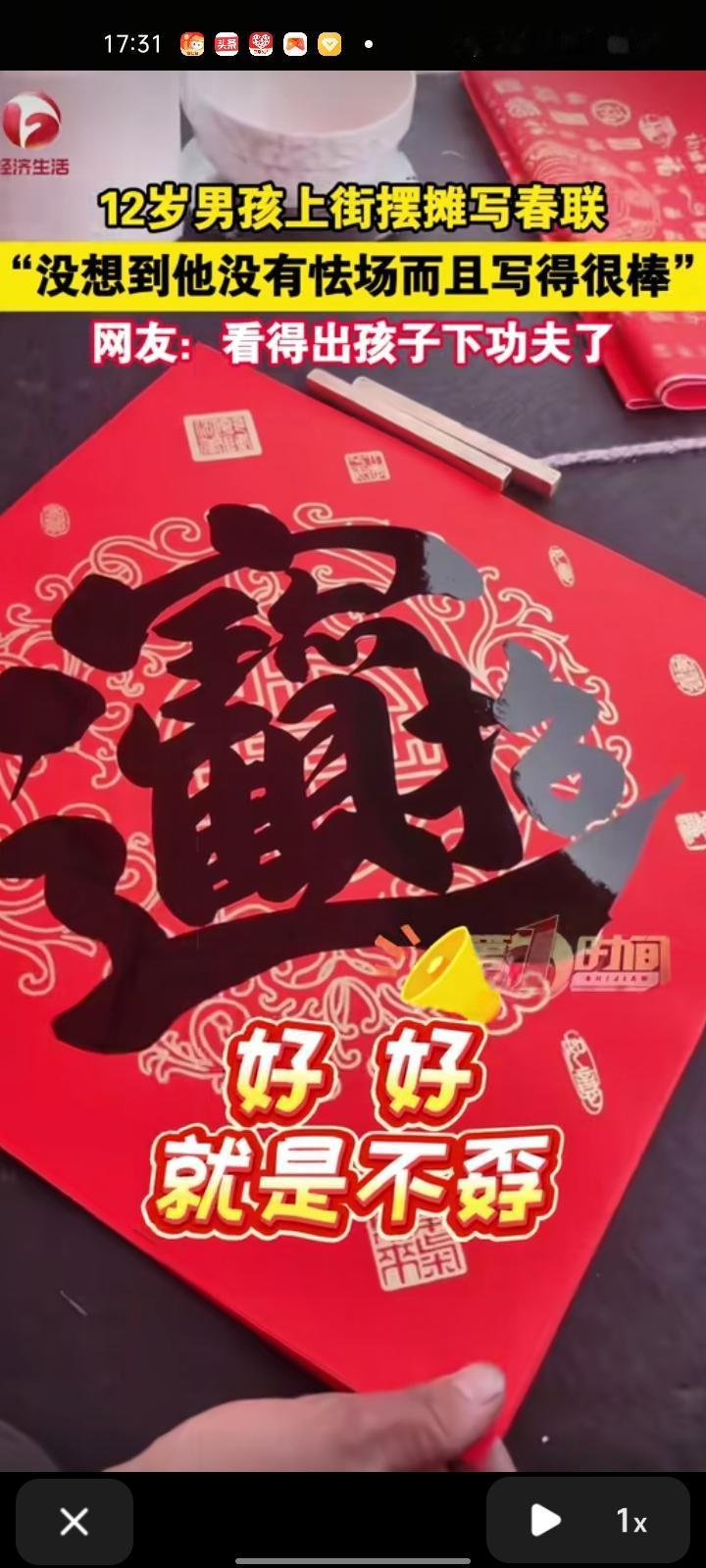 2月12日,宿州市砀山县。孩子妈妈叶女士发布视频称,12岁的儿子上街摆摊写春联,目前他已经练习书法一年半了,快过年了就想让他锻炼一下。平时在家写或集上写环境不一样,儿子没有怯场且写的很棒,字迹非常工整,村民们夸他非常棒,都等着他写对联呢。 宿州身边事 摆摊春联