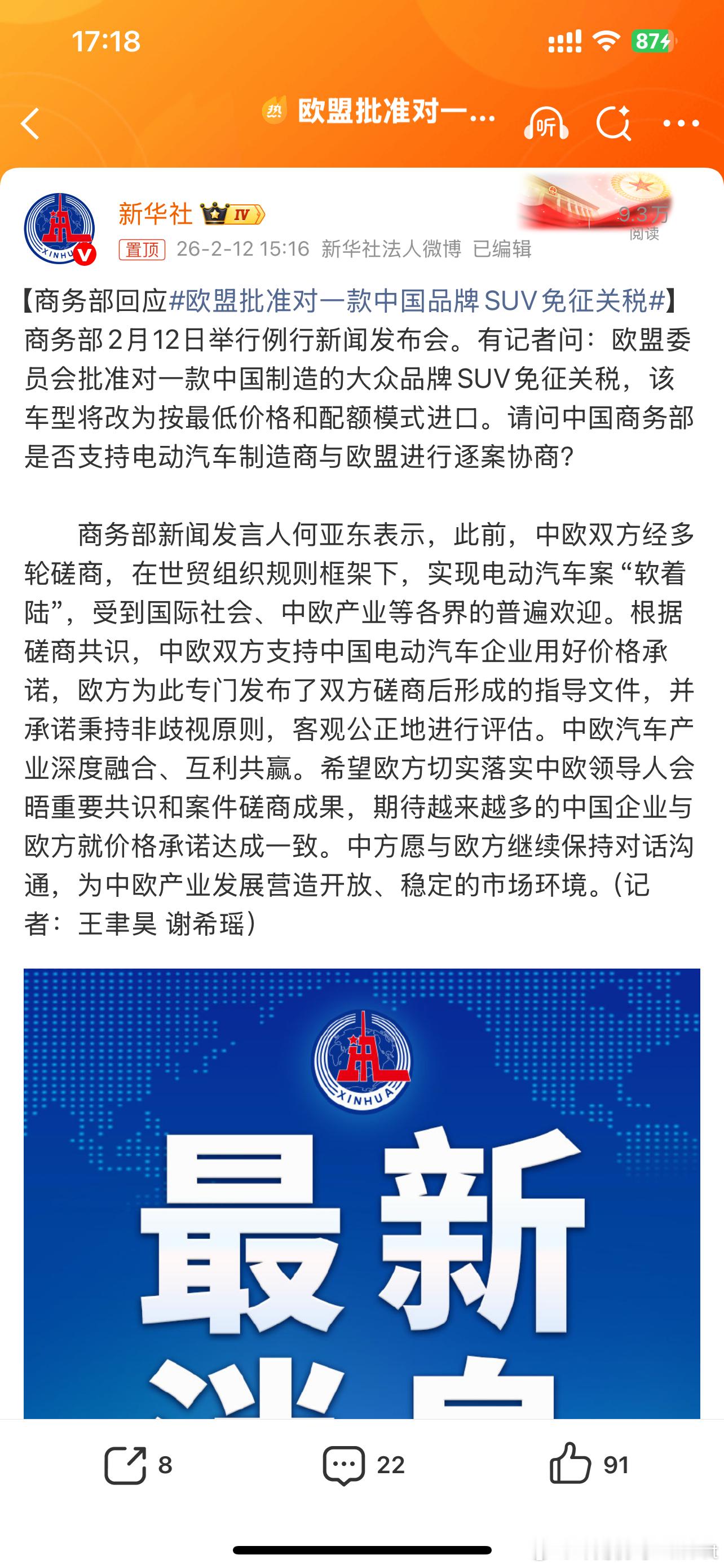 欧盟批准对一款中国品牌SUV免征关税免税的是大众安徽的金标大众与众06海外名字是CUPRA Tavascan这是一个利好消息因为在多轮磋商之后欧盟政策开始慢慢调整了