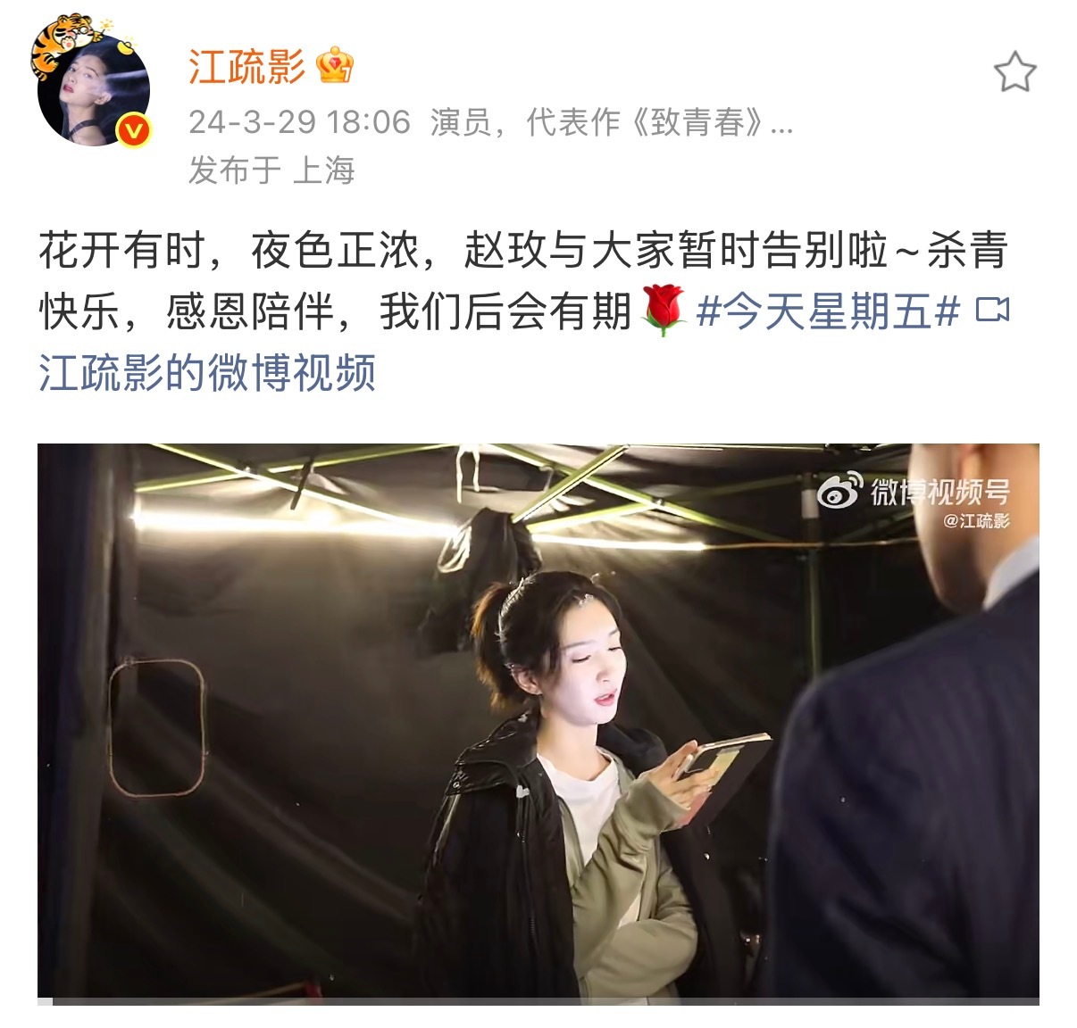 江疏影为赵玫发了22条微博 江疏影为赵玫发了22条微博,谁懂这个江江对角色的热爱度呢,从初见到杀青再到开播,现在诠释出自己的理解,我们的江江和赵玫一样通透清醒且豁达啊,江疏影谈到赵玫那种先保护自己再爱别人的观念,真的很大女主感啊,期待住和江江越来越多的角色见面啦~