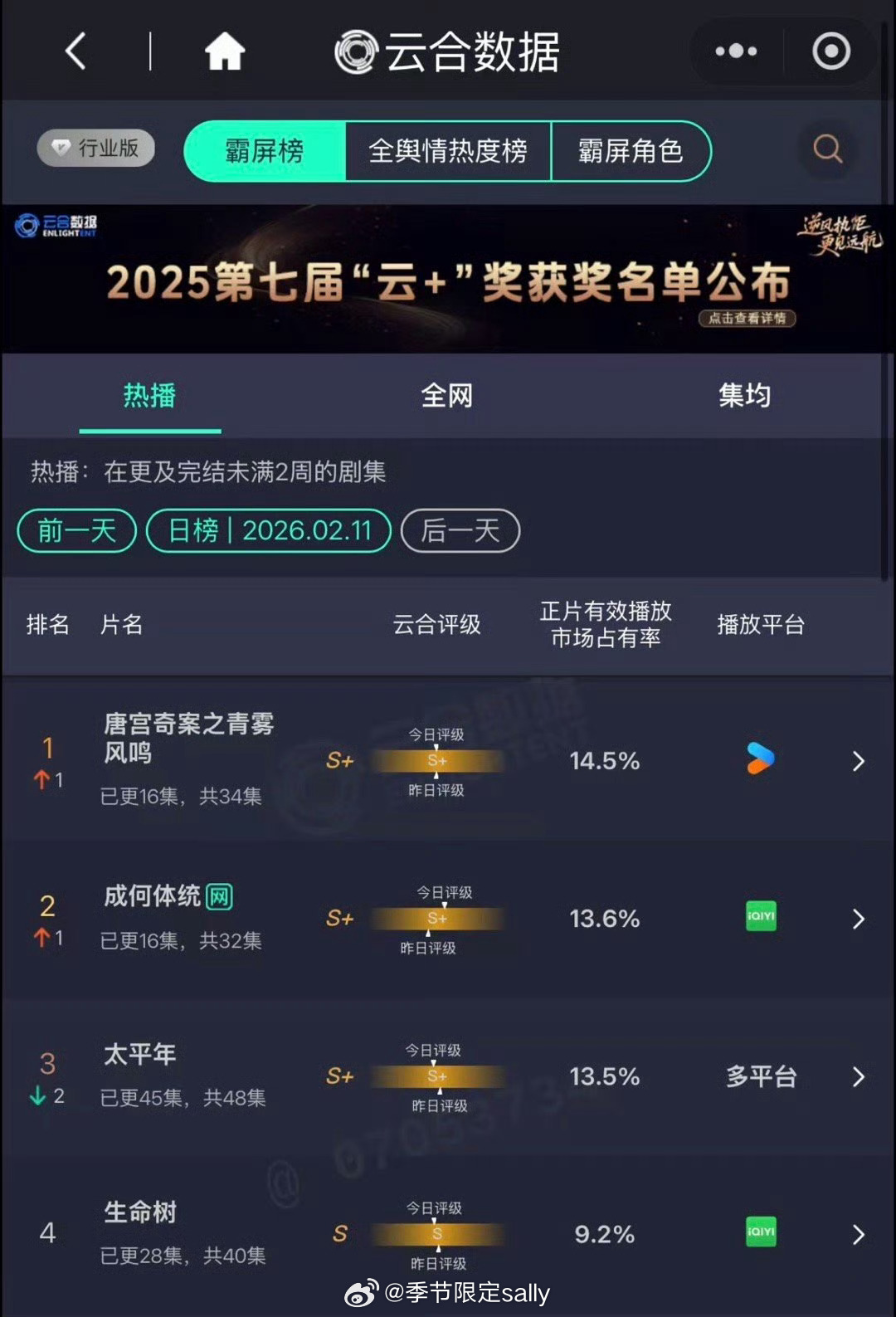 2.12云合🈶唐宫奇案14.5% 成何体统13.6% 太平年13.5%