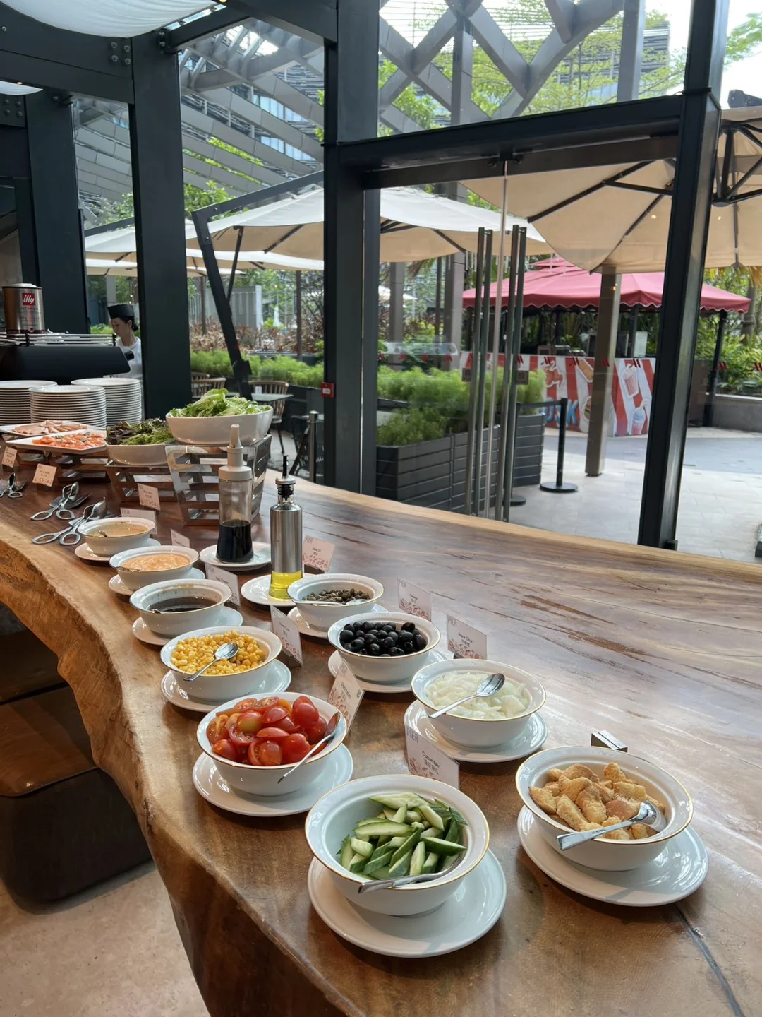 进门就被大堂16米高的环形水族缸震撼到!(在G层拍更好看)📸 1410平方米的超大游泳池超适合拍度假照,可惜冬天暂时不开放,但从外面就看到绿意环绕的景观真的超惬意~等夏天再来享受一次