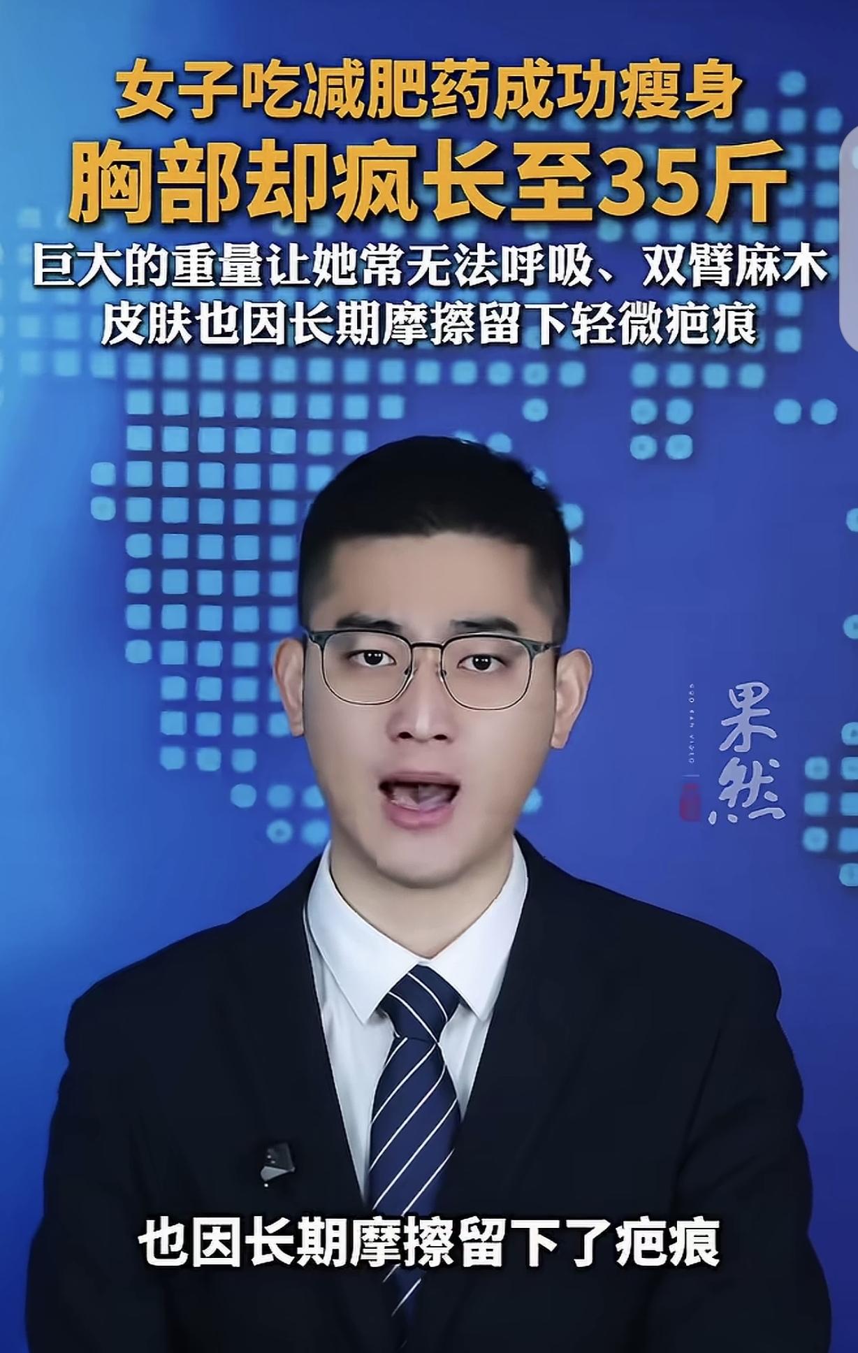 “这就是爱美的代价!”一30岁女子吃减肥药,成功瘦身可万万没想到,她腰身是面条了,胸部却疯长到了35斤,占体重的20%,胸口就像压了一块大石头,让她喘不上气,两个胳膊也是麻木的,胸下的皮肤也留下疤痕,女子去了医院,竟被诊断为“巨乳症”,女子崩溃了。网友:意思是其实没减,脂肪都换地方了。 在美国,有位30岁的女子,一直被肥胖问题困扰。她看着自己圆滚滚的身材,再看看大街上那些身材苗条、穿着时尚的姑娘,心里别提多羡慕了。 她无数次幻想自己能拥有面条般纤细的腰身,穿上那些漂亮的衣服,自信地走在街上。 为了实现这个梦想,她尝试过各种减肥方法。每天严格控制饮食,只吃少量的蔬菜和水果,饿得肚子咕咕叫也只能咬牙坚持。 她还拼命运动,跑步、健身操,一天下来累得瘫倒在床上。可即便如此,体重下降的速度还是慢得像蜗牛爬,离她理想中的面条身材差得十万八千里。 就在她感到绝望的时候,有人给她推荐了一种减肥药,说效果特别好,不用节食、不用运动,轻轻松松就能瘦下来。 女子心动了,她太渴望快速拥有面条身材了,于是毫不犹豫地买了减肥药开始吃。 刚开始,减肥药似乎真的起了作用,她的体重开始下降。看着体重秤上的数字一天天变小,女子高兴坏了,她仿佛看到了自己穿着漂亮衣服、自信满满的样子。她继续按时吃着减肥药,期待着能早日达成目标。 然而,好景不长。随着体重的不断下降,她发现自己的胸部开始变得越来越大。 一开始她没太在意,还以为是减肥过程中的正常现象。可没想到,胸部就像吹气球一样,越变越大,最后竟然疯长到了35斤,占了她体重的20%。 这下,女子可遭罪了。她的胸口就像压了一块大石头,每走一步都觉得喘不上气来。 两个胳膊也因为胸部的重量变得麻木,抬都抬不起来。而且,胸下的皮肤因为长时间被压迫,留下了深深的疤痕,又疼又痒。 女子赶紧去了医院,医生诊断她患上了“巨乳症”。 听到这个消息,女子崩溃了,她怎么也没想到,自己为了减肥吃减肥药,结果人倒是瘦了,却落下了这么个毛病。 现在,她不仅生活变得极不方便,连健康都受到了严重威胁。她后悔极了,早知道会这样,当初就不该那么盲目地吃减肥药。 可现在说什么都晚了,她只能积极配合医生治疗,希望早日摆脱这痛苦的折磨。 有人说,估计她这个有可能是一个巧合,就是服用减肥药瘦身的同时,激素分泌的总量没变化,继而导致她因此被刺激的乳腺再次发育…… 有人调侃,但凡攻克丰胸,或者减肥,都已经够牛了,同时攻克丰胸和减肥,那岂不是逆天了?我想让我老婆减肥! 这个美国女子的遭遇,真的印证了爱美需谨慎这句话。她为了快速变瘦,选择吃减肥药的心情其实挺能理解,毕竟试了那么多方法都没效果,换谁都会焦虑和急切。 但减肥药的副作用实在太离谱,脂肪没消失只是换了地方,反而给她带来了比肥胖更严重的麻烦。 现在她要拖着35斤的胸部生活,不仅外观上难以接受,身体也承受着实实在在的痛苦。走两步就喘不上气,胳膊还麻木,胸下的疤痕又疼又痒,估计连睡觉翻身都费劲。 更让人糟心的是,之前减肥的努力全成了笑话,反而落得一身病,这种从极度高兴到彻底崩溃的落差,换谁都扛不住。 这件事也给大家提了个醒,减肥哪有什么捷径。那些说不用运动、不用节食就能轻松变瘦的,背后说不定藏着各种看不见的陷阱。 还是得老老实实管住嘴迈开腿,不然真就像这个女子一样,得不偿失。 对此,你怎么看?
