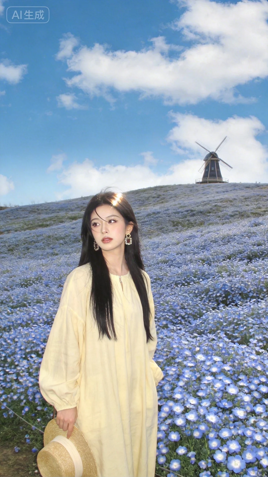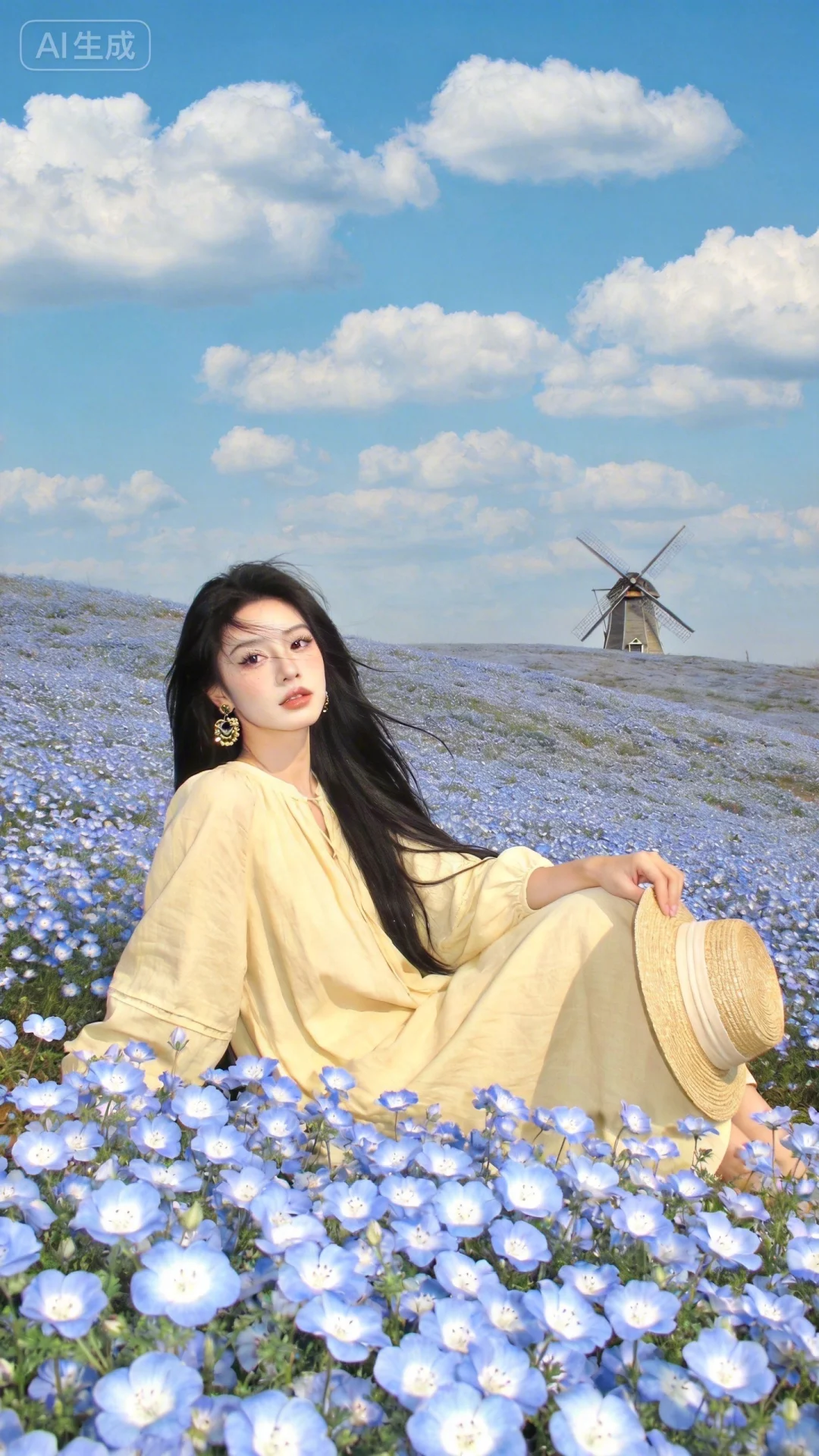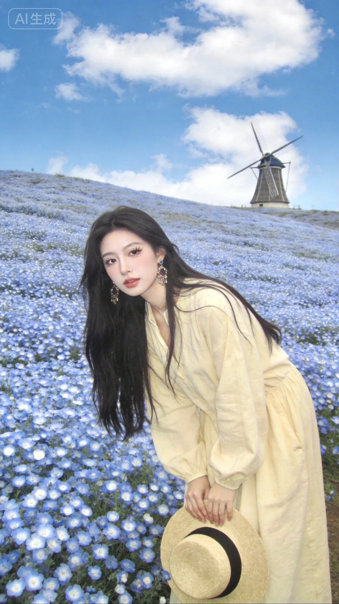 天空与远景:上方是澄澈的蓝天,白云飘飘,与花海的色调完美呼应。有荷兰大风车。
