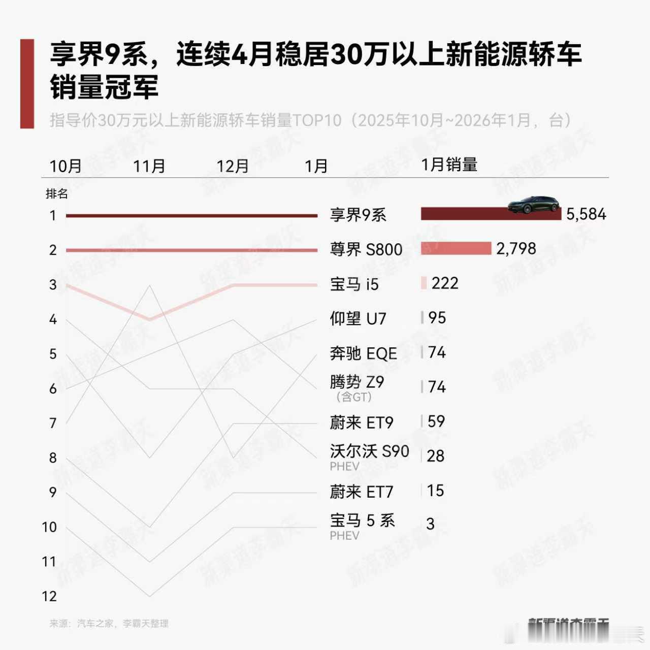 享界 9 系,连续 4 个月蝉联 30 万元以上新能源轿车销量冠军