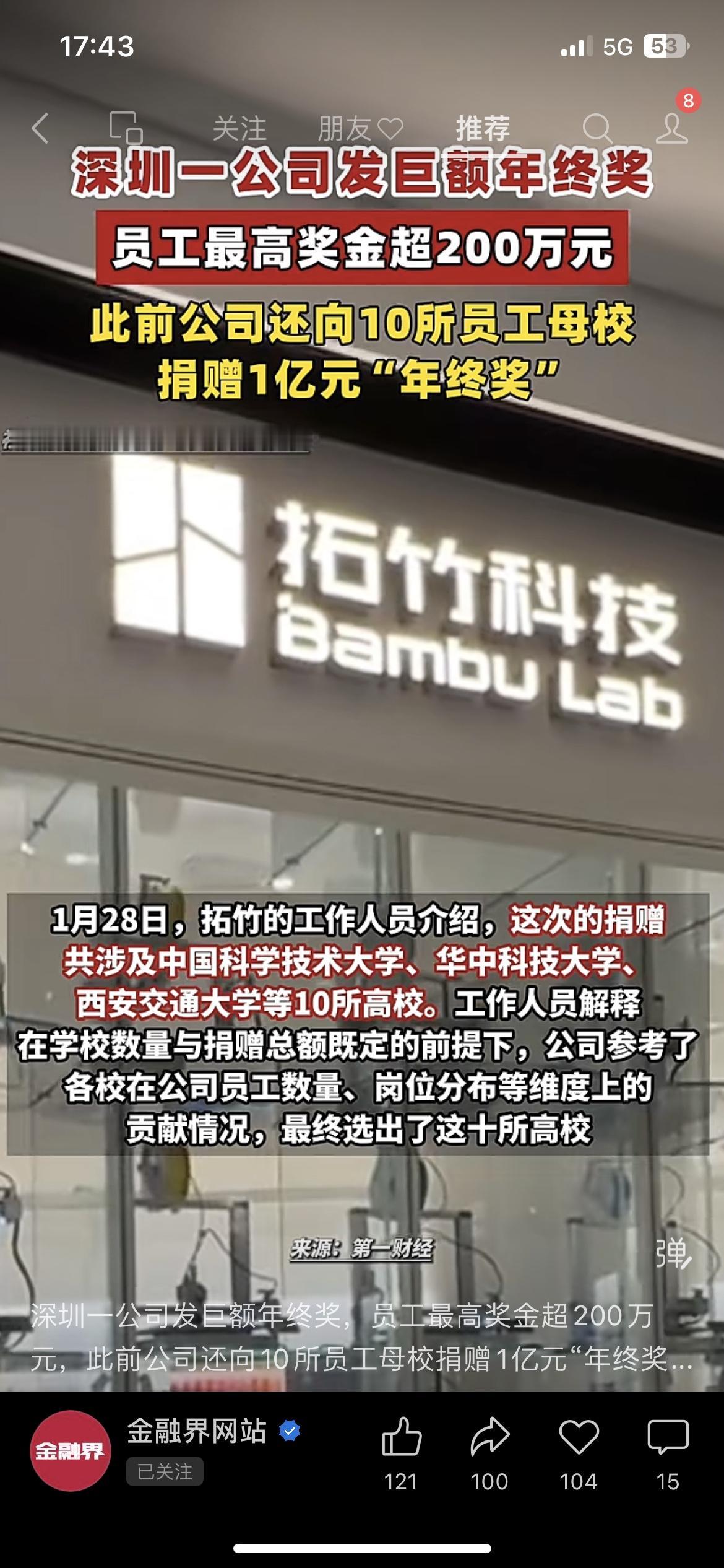 真正有格局的科技公司,真的不一样! 深圳拓竹科技,员工年终奖最高超200万,还直接给10所高校捐了1个亿“年终奖”。 不内卷、不抠门、肯分钱、肯助学,这才是中国科技企业该有的样子。 比起只会画饼的公司,这种愿意真金白银回馈员工、回馈教育的企业,才值得被点赞! 你们公司年终奖发了吗? 拓竹科技年终奖 硬核科技公司