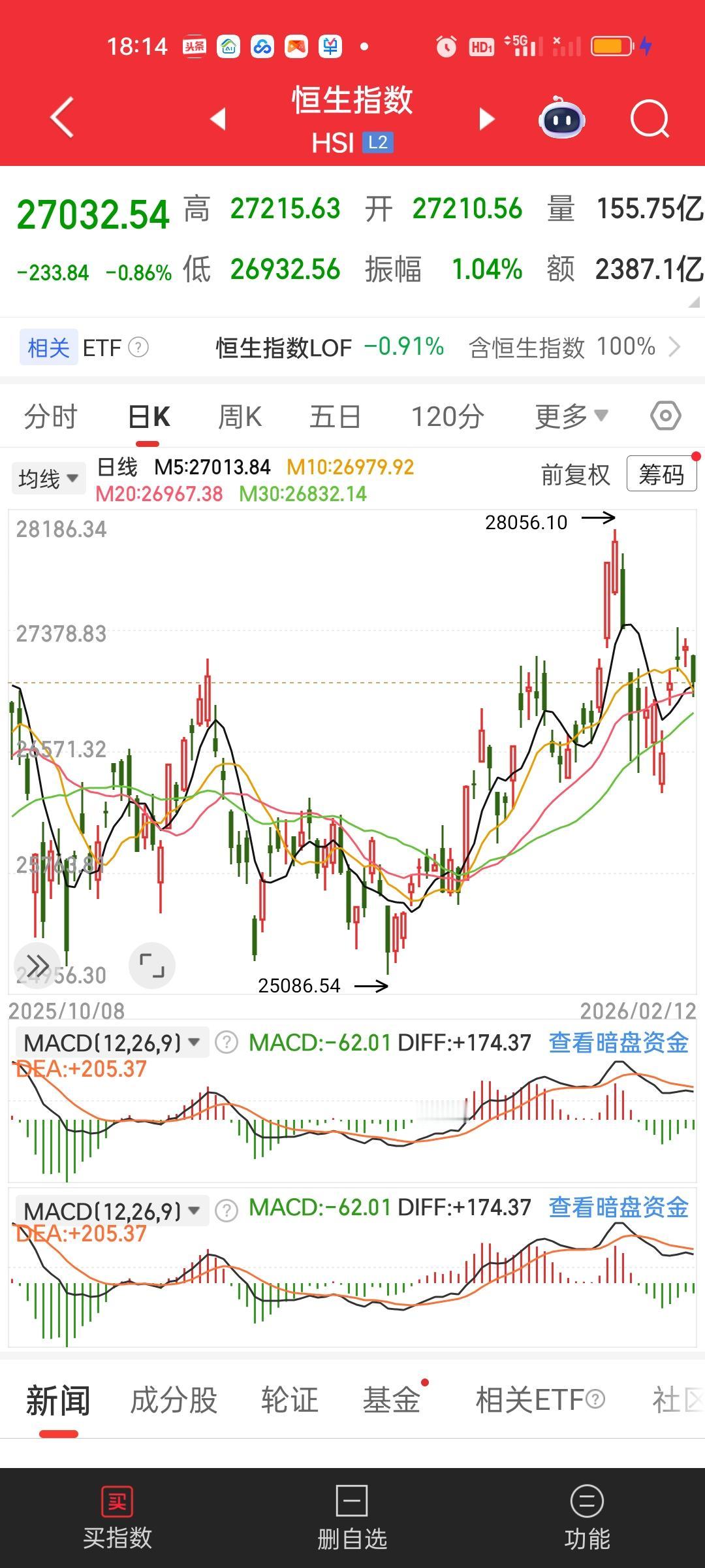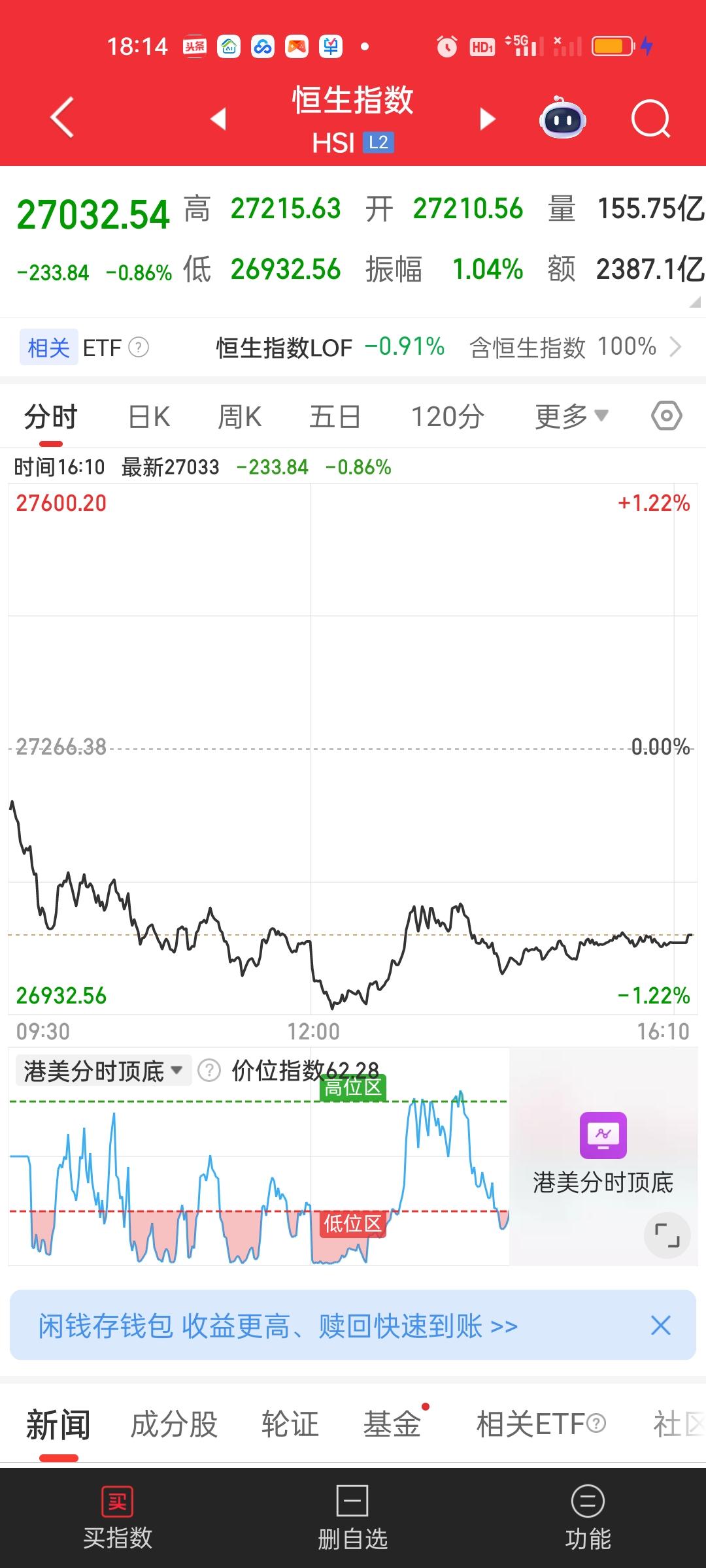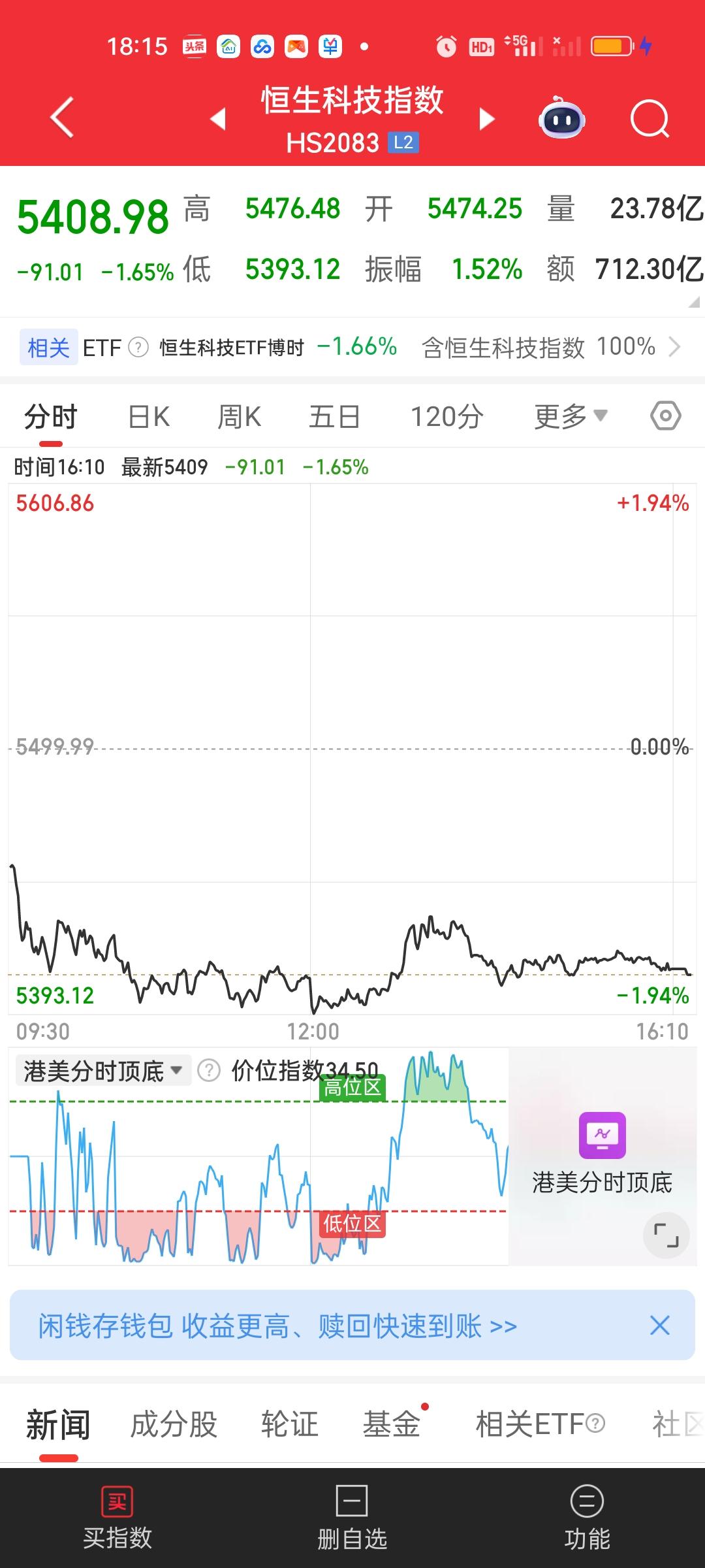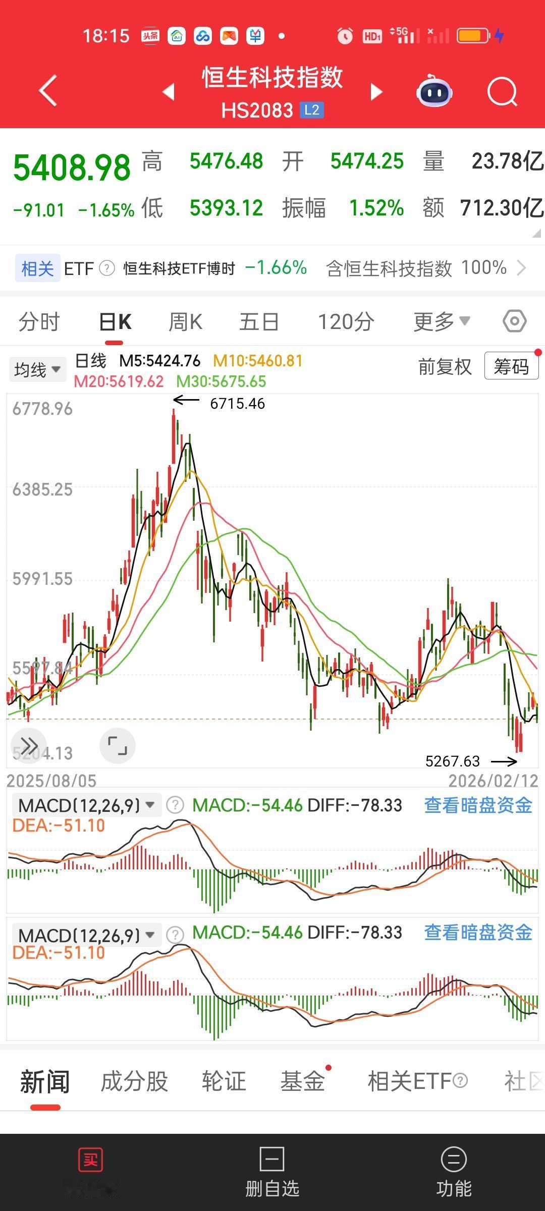 港股还是显得很弱势啊。恒指收盘还是收在所有均线上方,但恒科已经跌破了全部均线。不过这个地方没有必要特别担忧。前面的低点5267.63并没有跌破,眼光放长远一点,还是之前的那个操作思路,你就当定期存款操作就行了。
