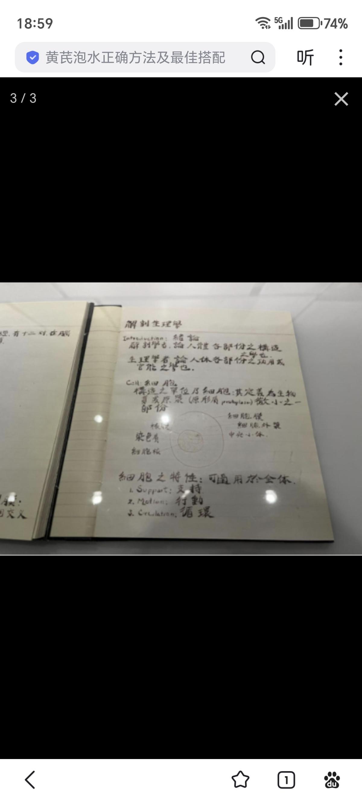 1937年日军侵占南京时,美籍人士罗伯特·威尔逊是留在南京城内唯一的外科医生。他虽是美国人,却生长于南京,他常用“我们”来称呼中国人。威尔逊医生的手术任务十分繁重,单12月14日这一天,他就做了11台手术,到了12月18日,需要他直接救助的伤者已经高达150人。为了完成手术,他甚至用针筒往身体里注入激素。图2、3是罗伯特·威尔逊用中文记录的《解剖生理学》笔记。