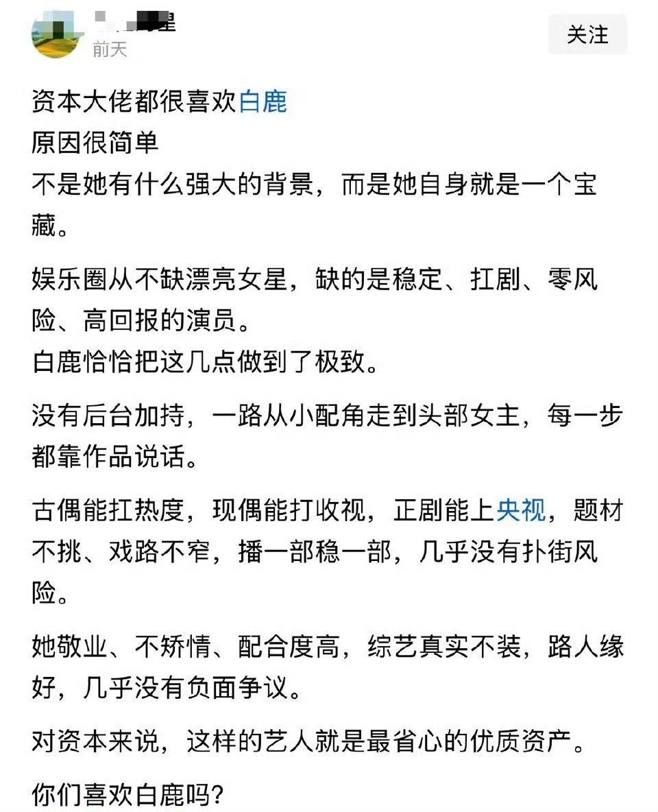 网友分析的,资本大佬都很喜欢白鹿,原因很简单