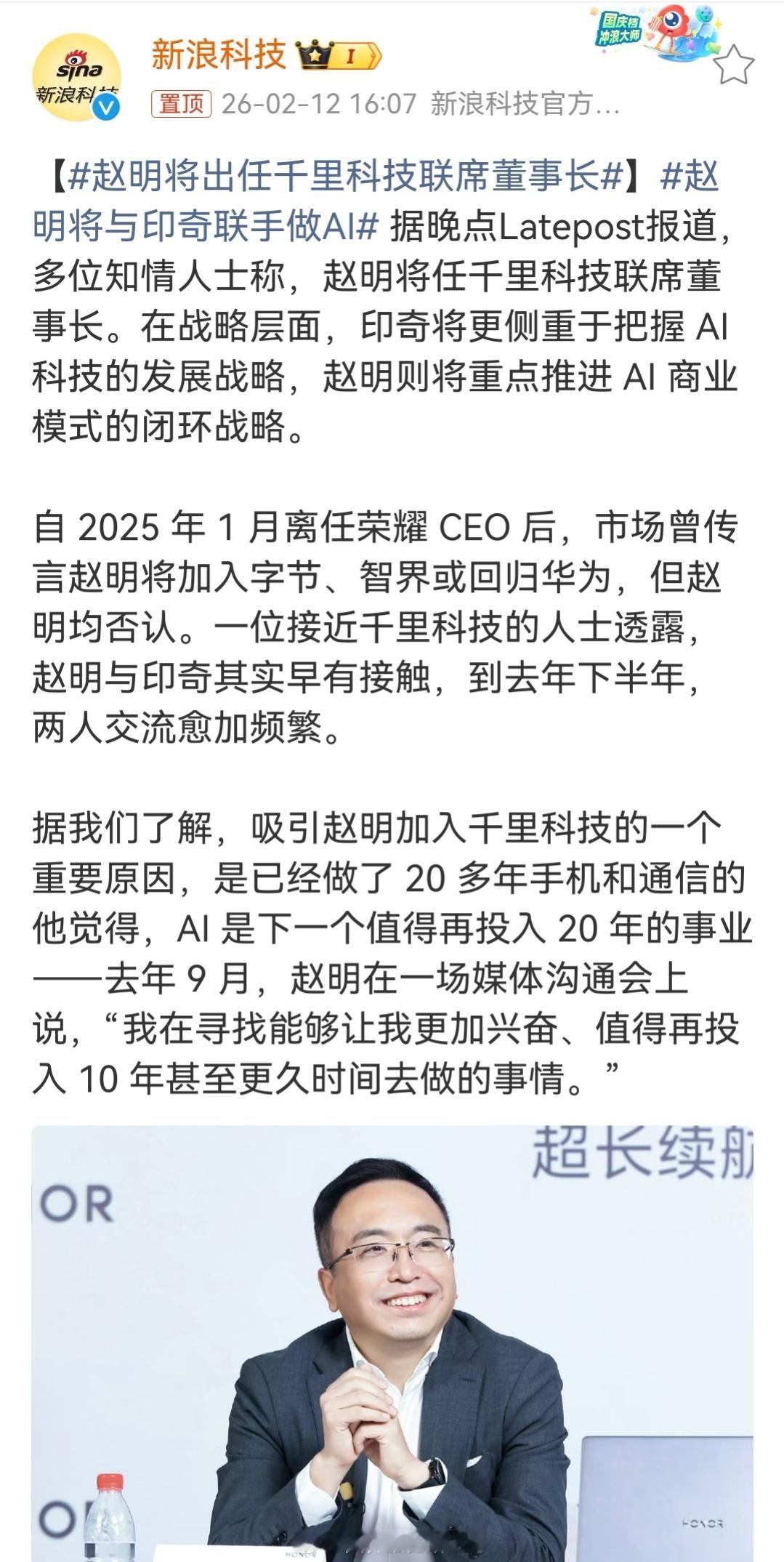 赵明将出任千里科技联席董事长这个千里科技的智驾业务是整合了来自吉利、旷视超千