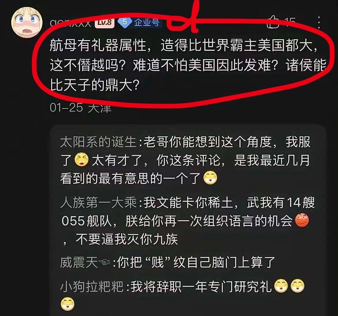 这是今天看到的最好笑的了。 中国造的航母不能比美国大,因为航母具有礼器属性,诸侯不能盖过天子。 新中国都建立要80年了,他都还跪在大清那里啊。 说实话,能找到这样一个角度来舔美,我着实没有想到。 你说他没有文化吧,他又知道礼器。 你说他有文化吧,他又不知道什么叫天子。 只有中国才能称天子,世界中央之国。 这是中国的天然属性,其它任何一个国家都没有。 美国是世界霸主不假,但看看春秋五霸,霸主就是霸主,哪一个敢僭越称天子? 连霸主和天子都没有搞清楚。 真可怜。 美国找的这都是些什么人啊,这钱不是白花了吗? 点右上角关注我,我们一起去看这个魔幻的世界