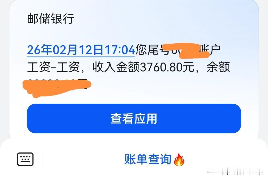 下午5点多,手机响了一下,知道是信息到了。忙慌的点开一看,原来是发工资了。不过不是念念想想的二月份的工资,是2025年的从工资里扣除后作为浮动积效的工资,单位去年早都核弄好了的,早都上报财政待发的。如今已是2026年2月中旬了,这笔钱今天终于到帐了,1月份的工资除了房贷和其他花销基本见底了,就盼着2月份的工资和第13薪了,年关将至,盼望着,盼望着,这个来了!也不错,年底备点年货应该可以吧?就是不知道2月份的工资还来不来,第13薪还有没有,继续盼望着,盼望着!年底发工资 发工资 等熬到发工资
