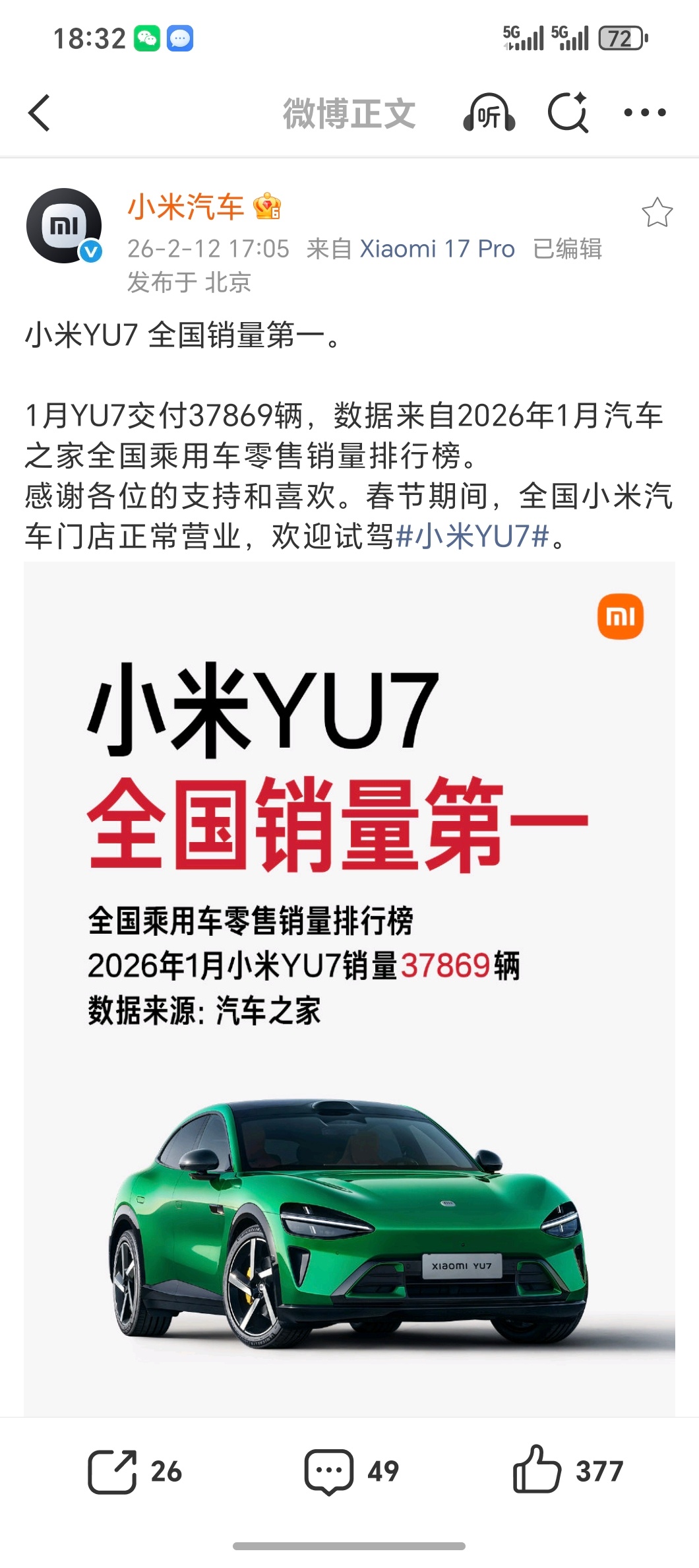 2026开年,小米YU7交成绩单了,1月销量37689辆,斩获无定语全品类销量第一,同时拿下中大型SUV、SUV品类、纯电车型多项第一!之前小米SU7销量力压Model3,现在又超越特斯拉最走量的SUV车型Model Y,更重要的是同时做到高均价、纯电、全品类第一,小米YU7以25-30万主流价位,真的做到了量价齐飞小米YU7一月销量37869台跻身榜首雷军回应YU7登1月销量榜首