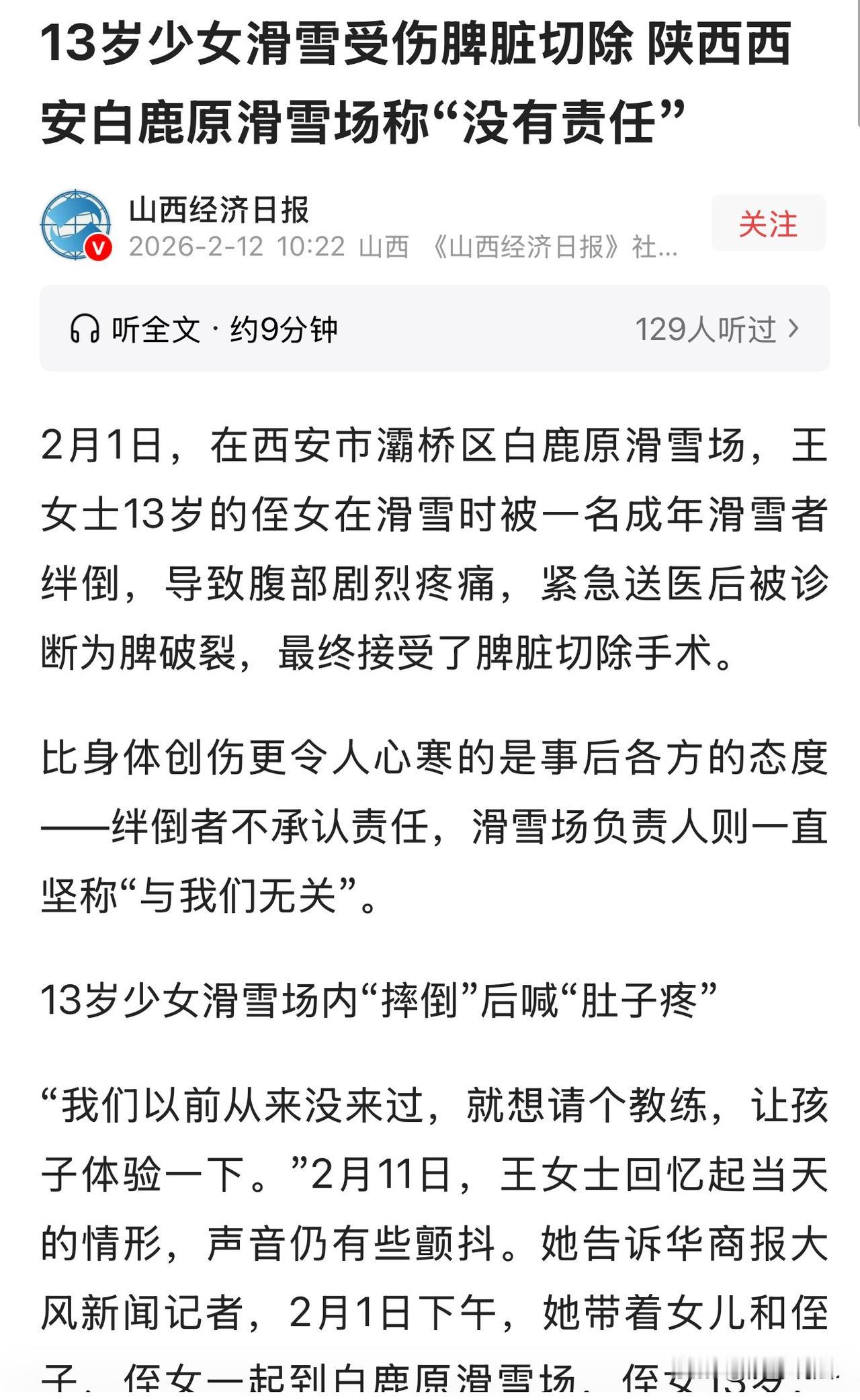 陕西西安,女子带13岁侄女去滑雪,还花360元请了教练。期间,女孩前方一名30多岁男子突然摔倒,女孩紧随其后,直接被绊倒,导致女孩切除脾脏。女子向滑雪场讨要说法,质疑门票为什么不带保险?滑雪场说,已经贴了提醒标识,他们没有任何责任,让女子去找男子追责。男子说,谁让你紧跟在后面,是女孩自己撞过来的,凭什么让我负责? 2月1日下午,王女士闲来无事,开启了遛娃模式,带着家里的仨孩子出门玩耍。 孩子们一听可以出去放飞了,各个欢天喜地,都吵着要去滑雪。 王女士看孩子们热情高涨,也就随了他们的心意,一行4人高兴高兴的往西安白鹿原滑雪场出发。 这几个孩子中,就数她13岁的侄女年纪小,还是第一次滑雪,一点经验都没有,王女士一路上都格外小心,生怕孩子出一点意外,跟哥嫂没法交代。 到地方后,她赶紧去排队买票,一问门票可不便宜,她思来想去,为了节省点钱,就给3个孩子买了门票,没买自己的,共花了800元。 孩子都是家里的宝,既然带孩子出来了,就要承担起责任,自己不玩可以,但是得让孩子在自己的眼皮子底下,这样才能放心,于是,她花了20元买了观赏票。 从头到尾,工作人员也没有提过一句保险的事,既没有问她们要不要买保险,也没有提醒滑雪有风险需要注意。 王女士根本没往这方面想,就高高兴兴的带着3个孩子进了雪场。 进去之后,王女士为了让孩子玩的尽兴,又花300多元,请了教练。 随后,教练教了大概一个小时就离开了,让几个孩子自己去初级雪道滑。 由于观赏区离滑雪场有一段距离,王女士根本不能注意到每个孩子的情况,她心里莫名的有些不安。 下午五点五十分左右,意外突然发生了,王女士的侄女13正在初级雪道上正常滑行,前方一名男子突然滑倒,她根本来不及躲开,直接被绊倒,重重地摔在了雪地上。 在外面的王女士亲眼看到侄女摔倒,吓得心都要跳出来了,她拼命大喊呼救,可因为没有票,工作人员就是不让她进雪道。 她只能在外面干着急,足足等了好几分钟,受伤的孩子才被工作人员带出来。 此时孩子已经疼得脸色惨白,腰都直不起来,王女士吓得手脚发软,一刻不敢耽误,赶紧带着孩子往医院赶。 2月1日晚上到第二天凌晨,是全家人最煎熬的时间。 孩子送到医院后,被紧急检查,最终确诊为闭合性腹部损伤、脾破裂,情况非常危险,必须马上手术。 医生连夜为孩子做了脾脏全切手术,命是保住了,可这个才13岁的孩子,永远失去了脾脏。 脾脏是人体重要的免疫器官,切除之后,孩子的免疫力会大大下降,以后要长期复查、细心照顾,一辈子都会受到影响。 看着病床上虚弱的孩子,王女士又疼又悔,整夜都合不上眼。 孩子情况稳定后,王女士一家开始找滑雪场和绊倒孩子的男子讨说法,希望对方能承担该负的责任,可结果让她们彻底寒了心。 滑雪场的孟姓负责人态度非常强硬,直接说滑雪场没有一点责任,理由是已经贴了风险提示,保险自愿买,也做了救护,孩子受伤是自己没控制好速度。 而那个滑倒绊倒孩子的男子,更是全程推卸责任,死不承认自己有错。 王女士一家根本无法接受,她们觉得,孩子是未成年人,又是滑雪新手,滑雪场本就该对未成年人尽到更高的安全保障义务,不仅没提醒买保险,救助也不及时,出了事就甩锅,太不负责任了。 有网友说:男子摔倒是不可预见。女孩子跟的太近,滑雪技术生疏等原因撞上去。未成年人应当是监护人承担责任。滑雪场收费,明知此类运动项目有危险性而没尽到安全责任。因此我觉得,男子没啥责任,倒是滑雪场要承担主要责任,孩子监护人也需要承担部分责任。 还有人说:作为收费经营单位,他能预见到这项运动可能出现的碰撞风险,所以,门票不包含保险就是滑雪场的问题。 本案中,三方均有责任,滑雪场应负主要责任,涉事男子与监护人负次要责任。 第一、滑雪场作为高危项目经营者,对未成年初学者未尽到更高安全保障义务:未主动提示保险、教练离场后无现场看护、伤者倒地后救援不及时、雪道秩序管控缺位,仅以张贴提示免责不成立。门票不含保险并非法定过错,但未履行告知与风险提示义务,加重其过错。 因此,应承担主要责任。 第二、涉事男子滑倒后未及时撤离雪道,造成通行障碍,对事故有直接过错。 第三、监护人将初学未成年人独自留在雪道,监护存在疏漏,应承担少量责任。