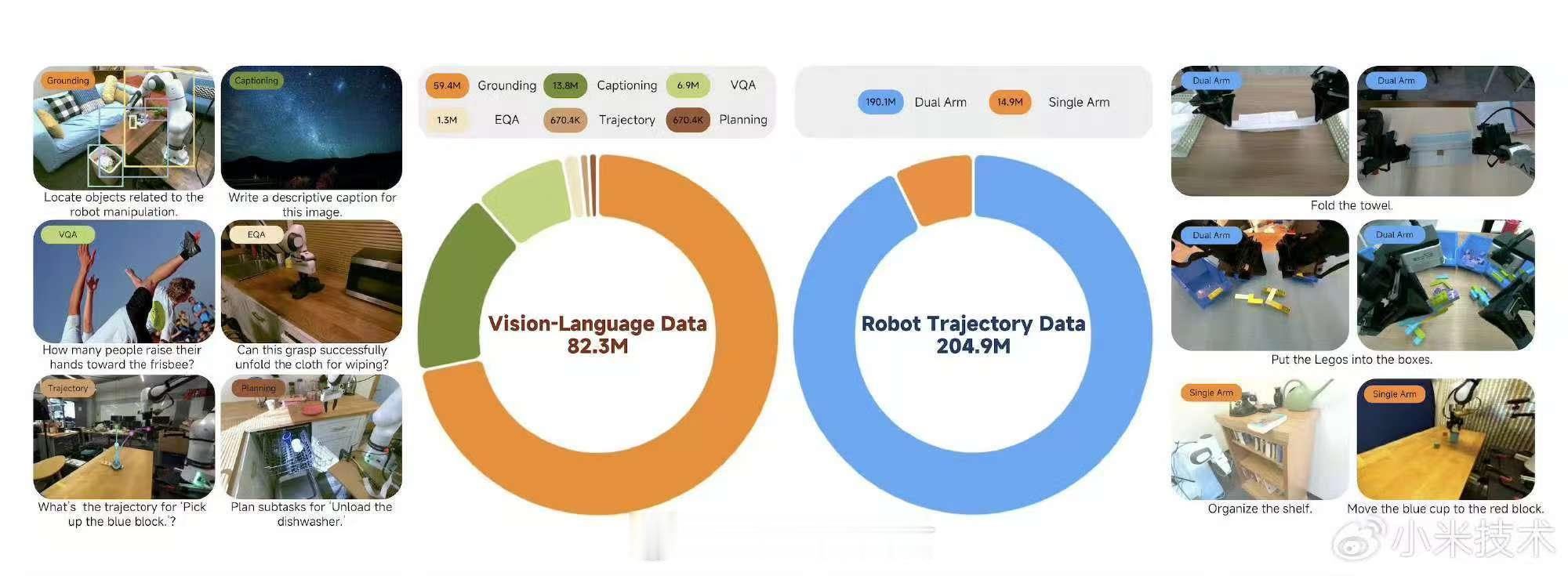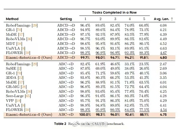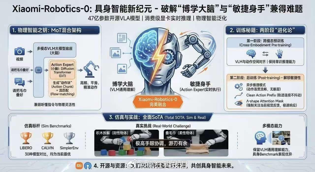 雷军公布小米机器人最新进展小米发布机器人基座模型小米机器人团队开源了一个叫 Xiaomi-Robotics-0 的大模型,简单说就是给机器人装了个“文武双全”的大脑。以前的机器人要么是“书呆子”,听懂人话但手脚笨,反应慢得像木头;要么是“肌肉男”,动作快但听不懂你说啥,只会干固定的活。在行业公认的三大测试集里,跟30多种模型比,它全拿了第一,平均成绩直接干到了98.7%,这在业内是相当炸裂的水平。