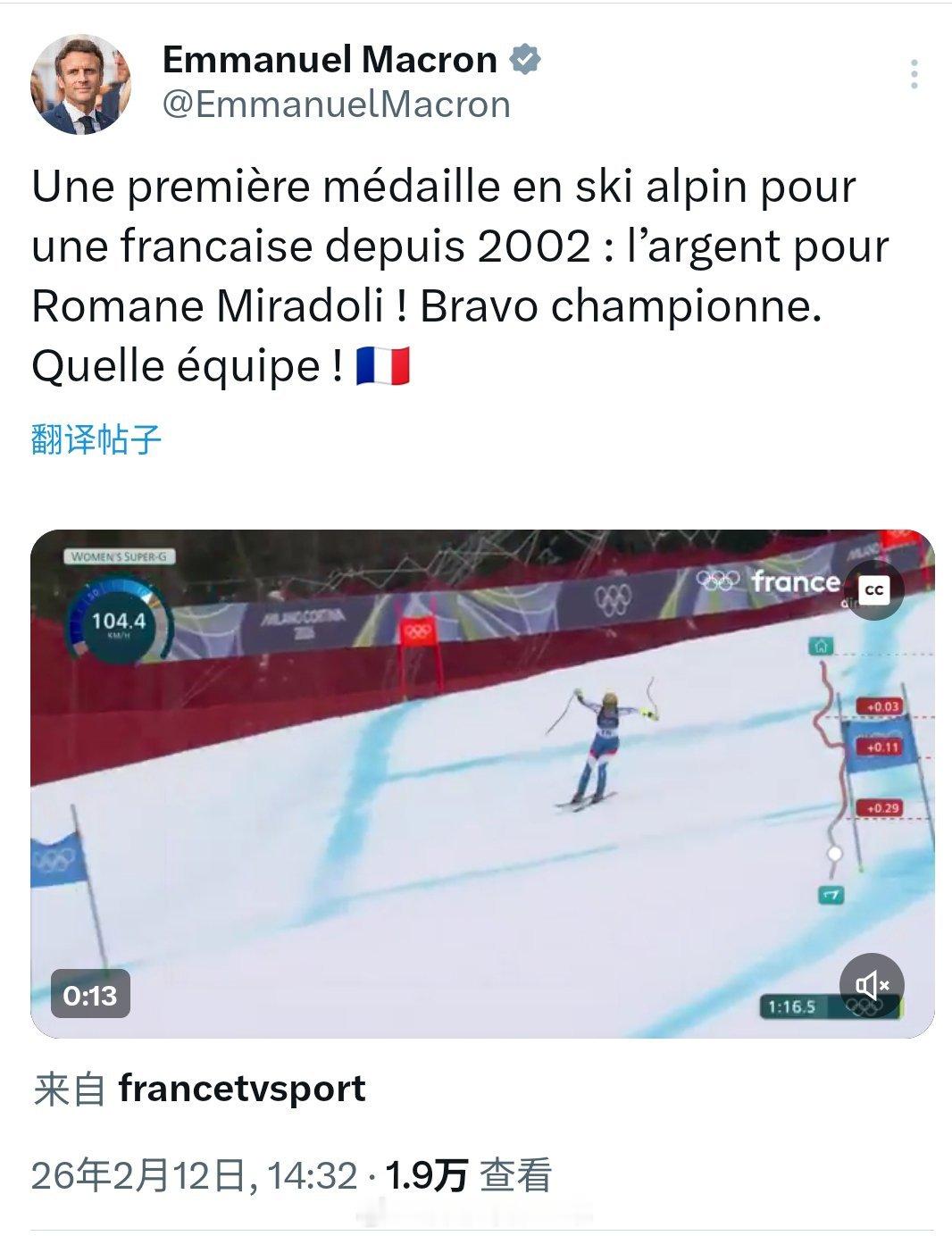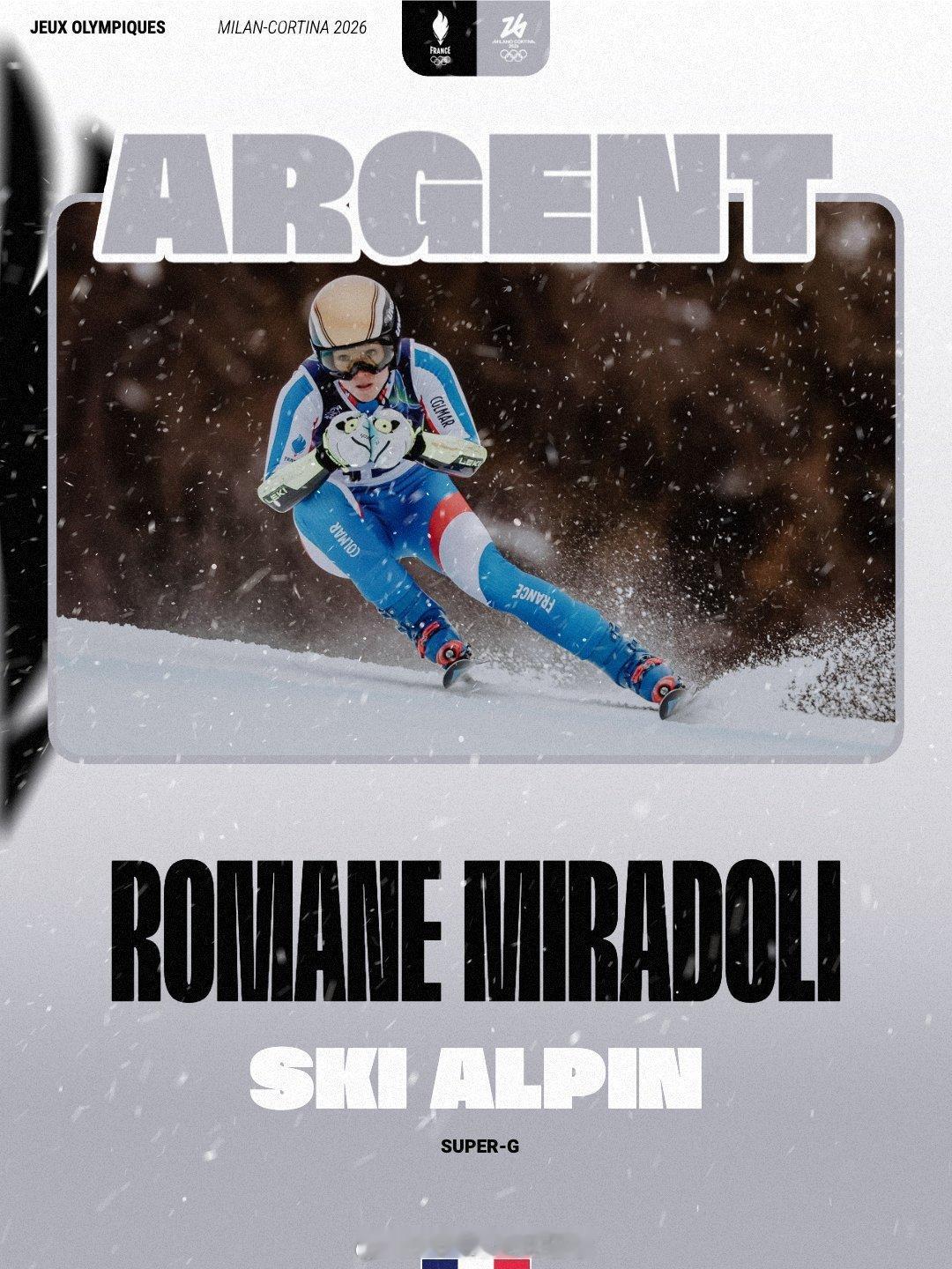法国高山滑雪女将罗曼·米拉多利(Romane Miradoli) 在米兰-科尔蒂纳2026冬奥会女子超级大回转(Super-G) 项目中勇夺银牌!🔥法国总统马克龙发推祝贺。